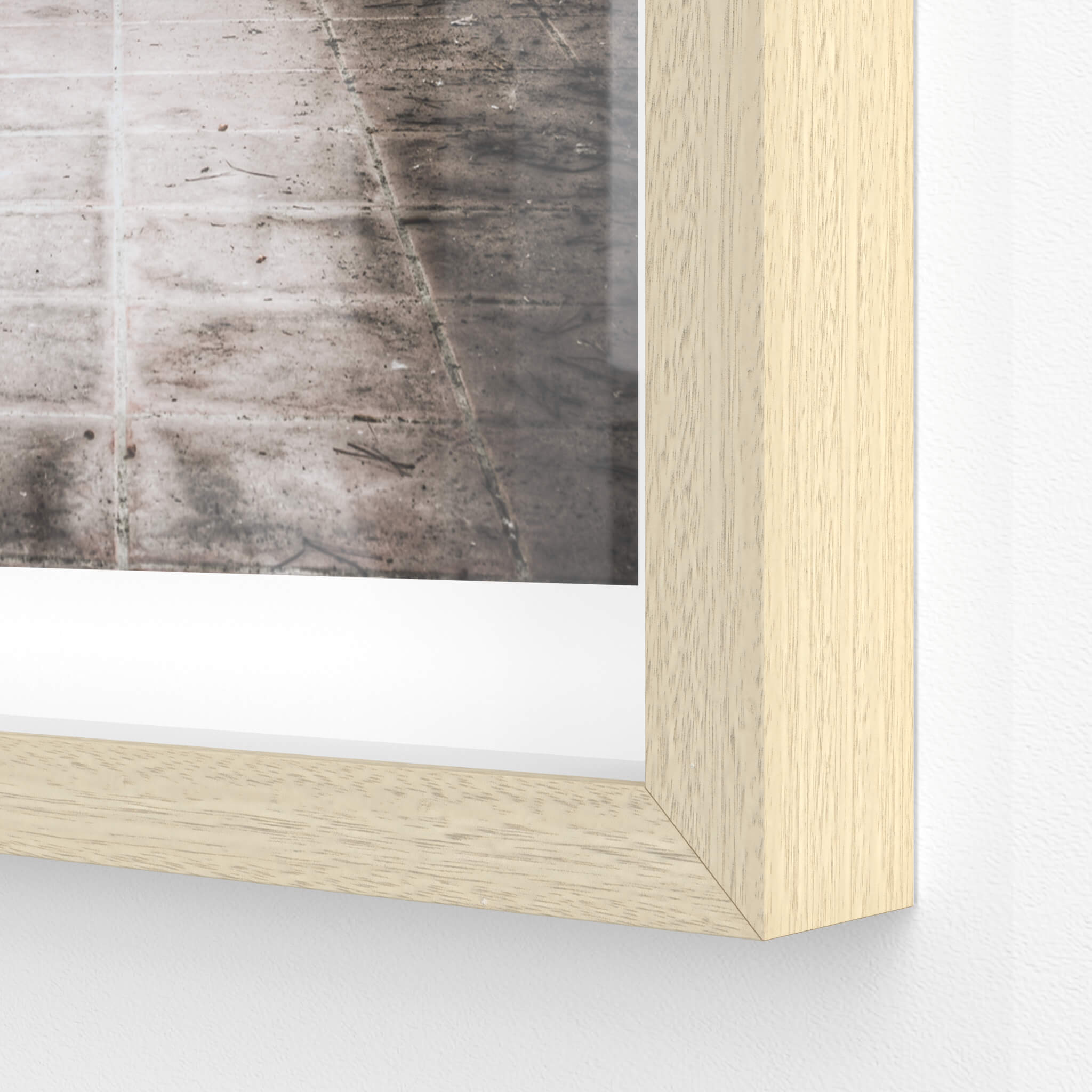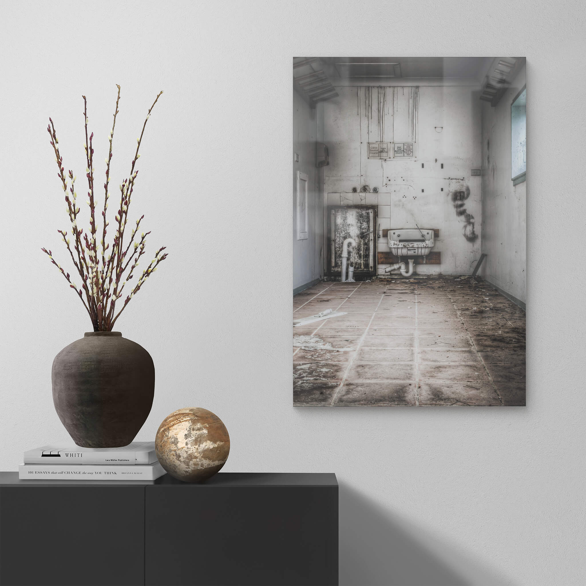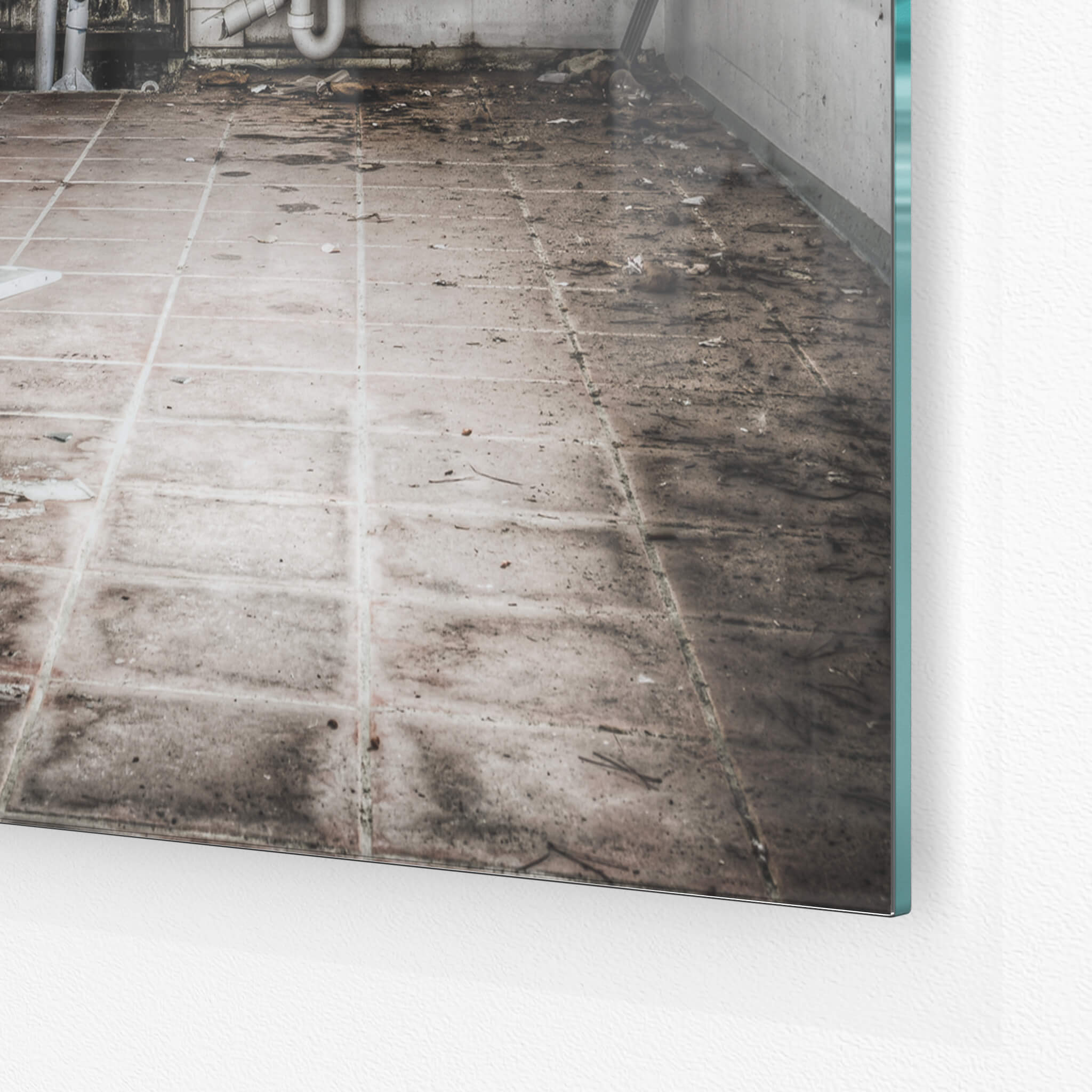 Glass print — 6mm toughened low-iron glass, bevelled edge, concealed mount.