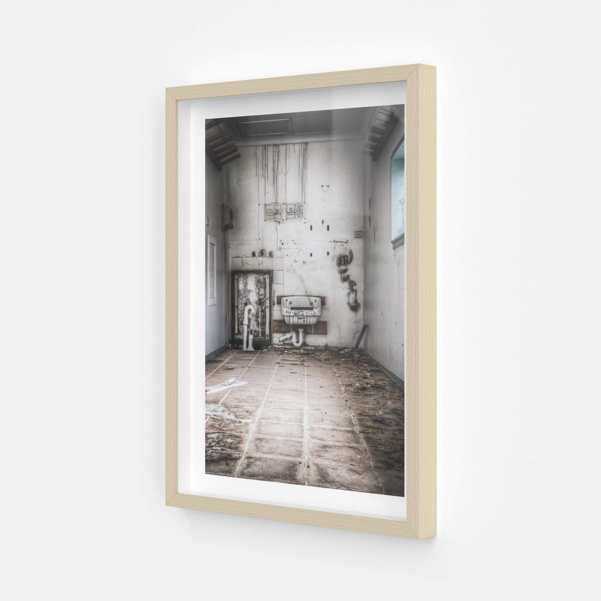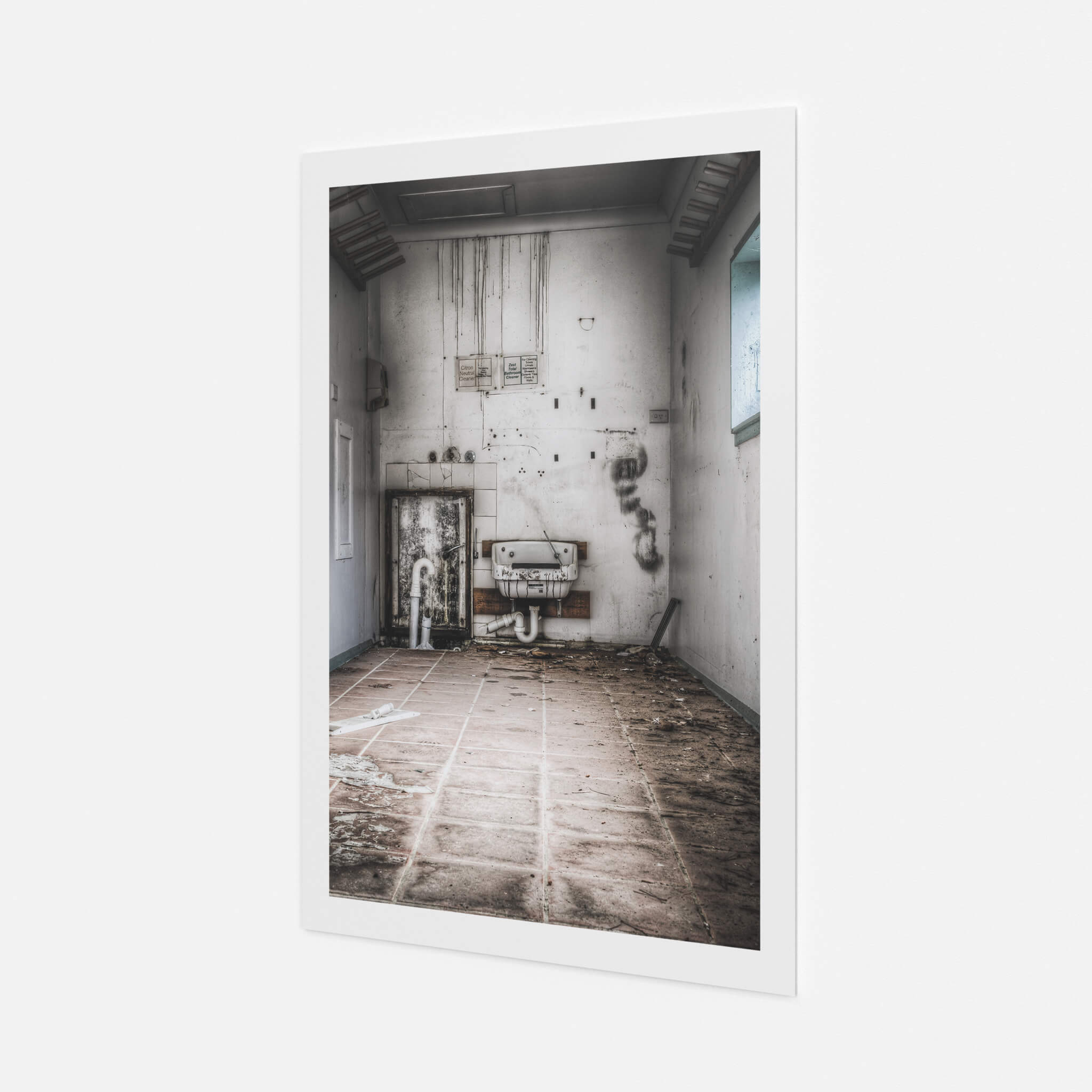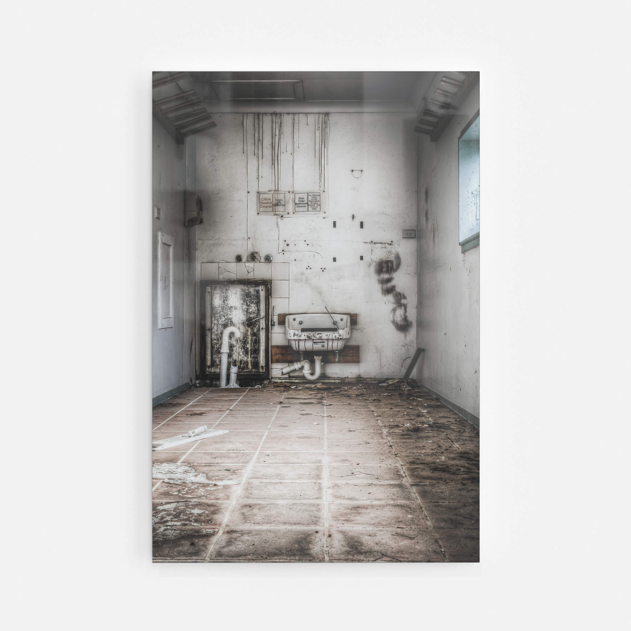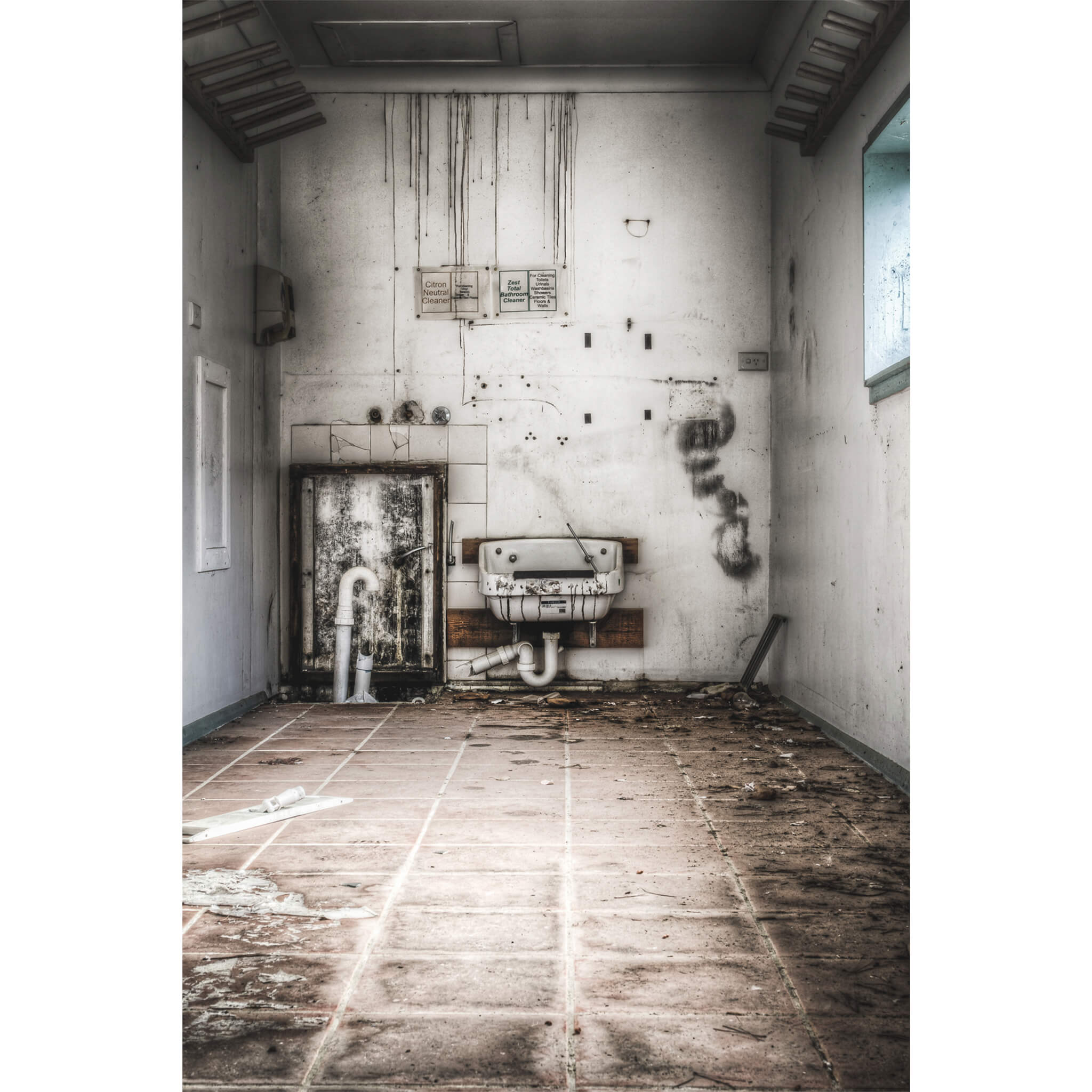 Inside the Queen Victoria Sanitorium, a cleaners room stands abandoned. Dust settles on forgotten buckets and brooms, remnants of a past daily routine. Light filters through a grimy window, illuminating the decay.