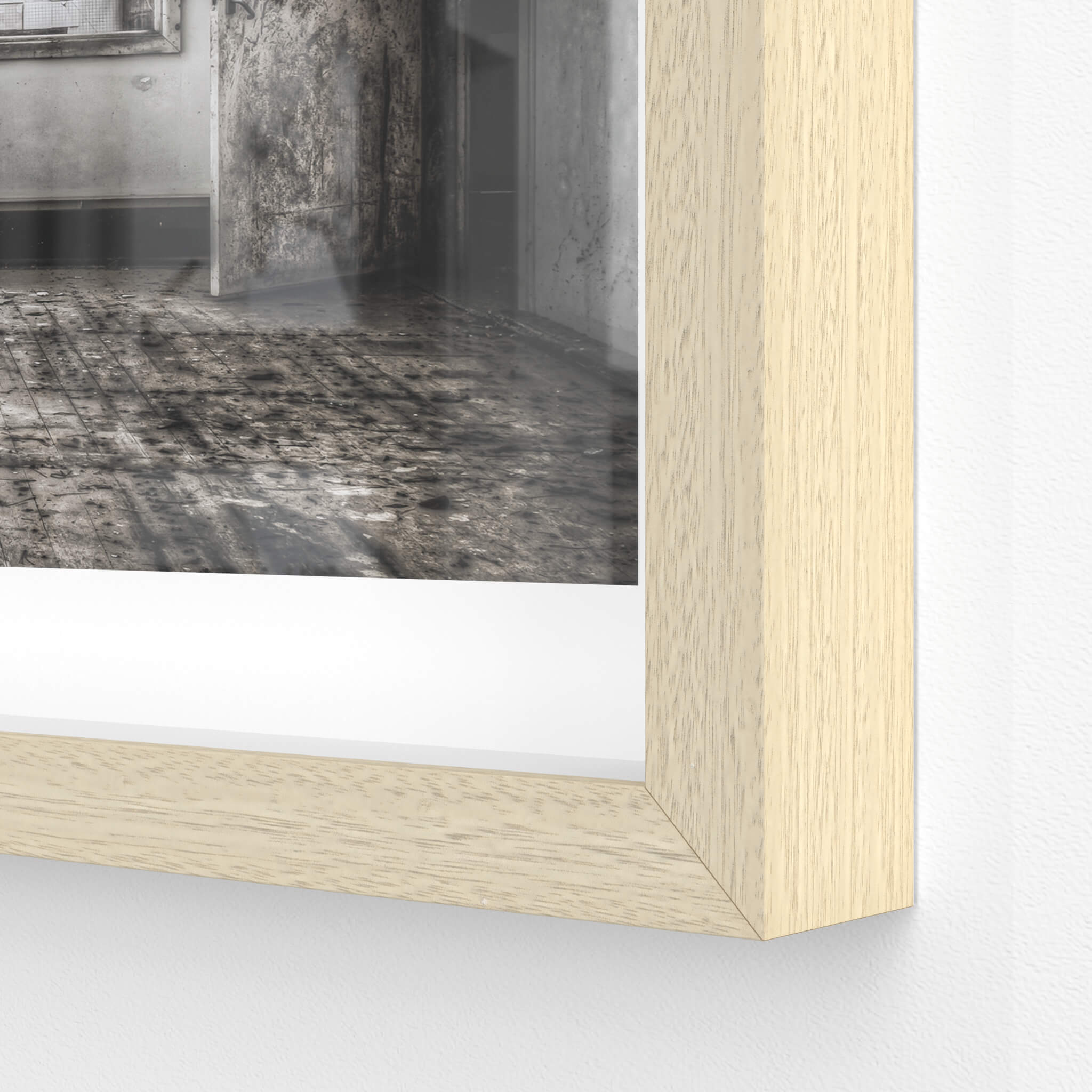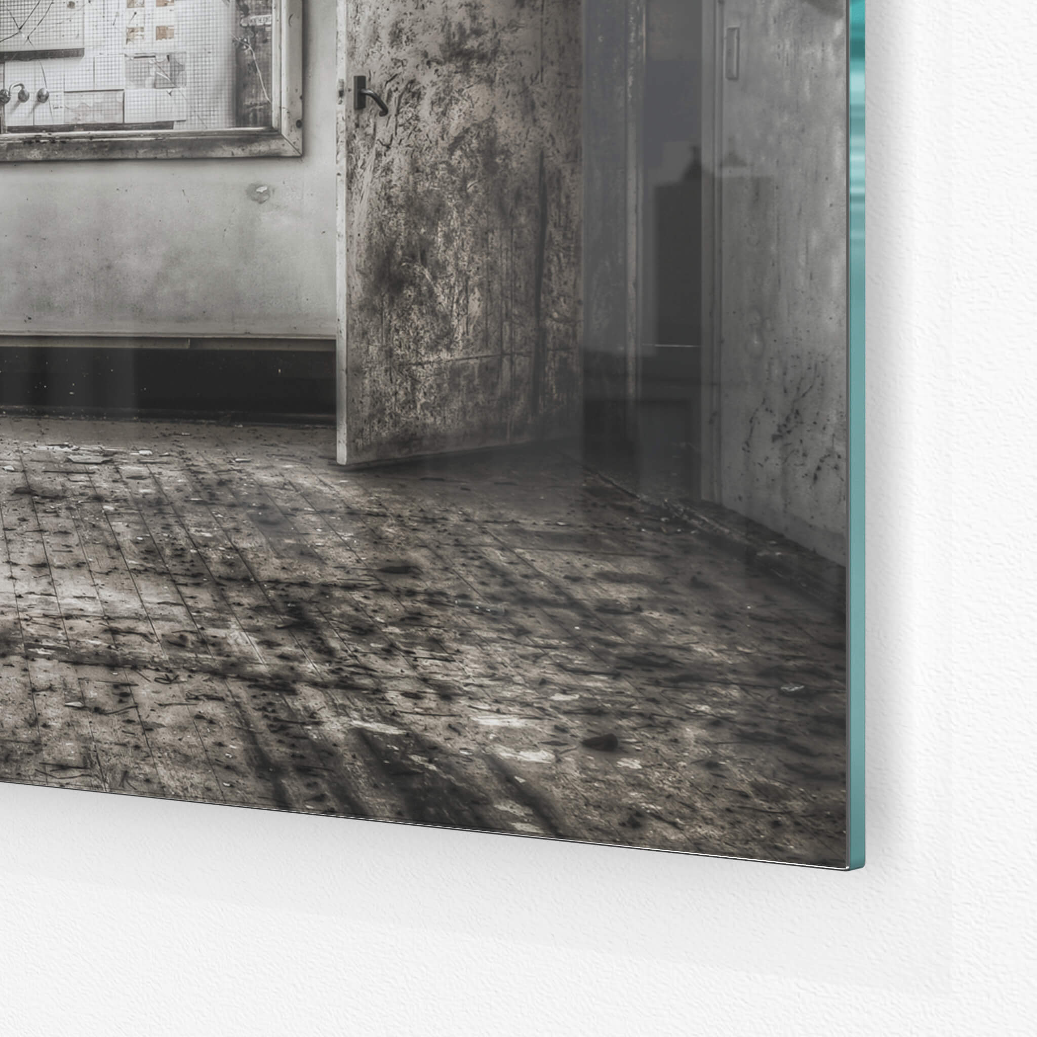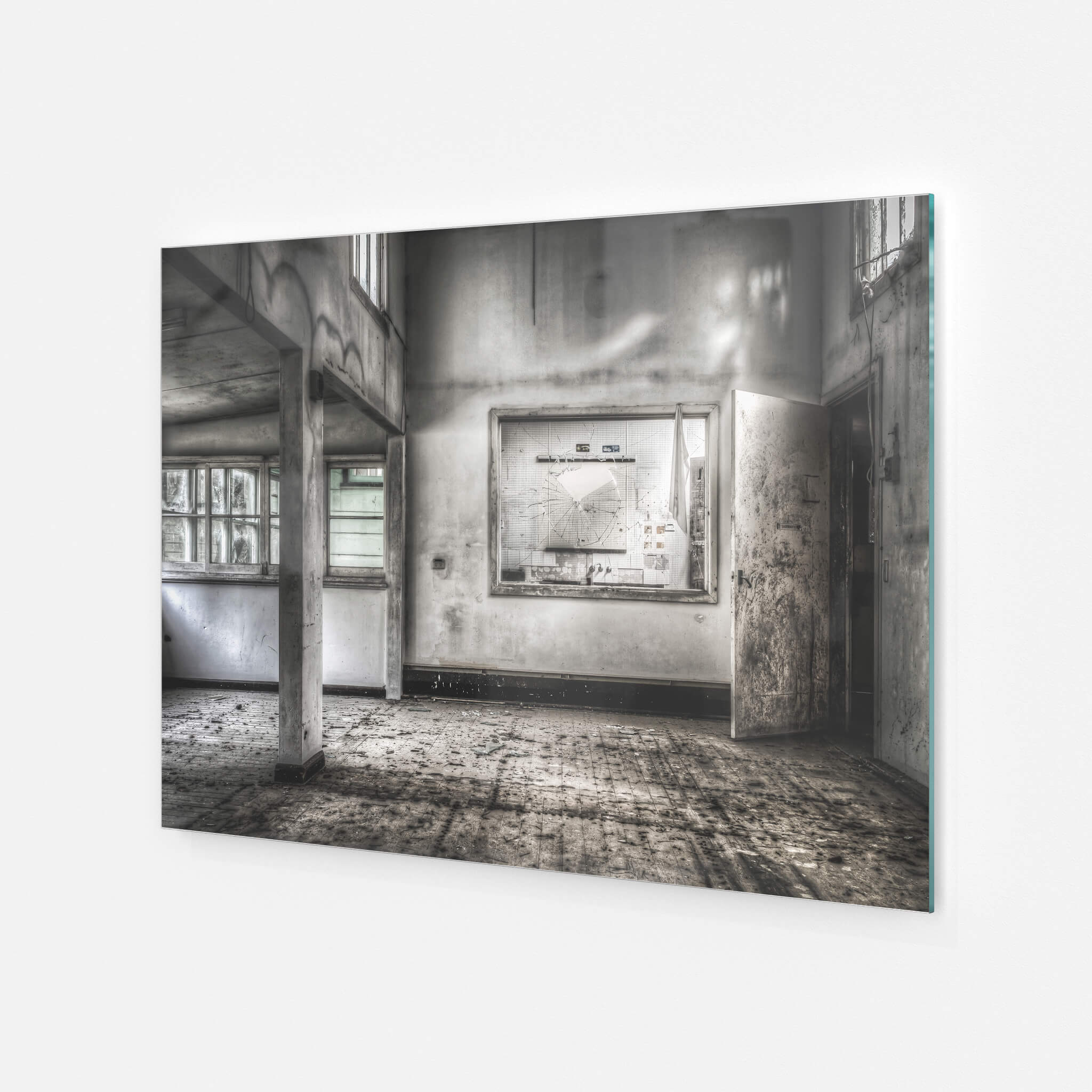 Glass print — 6mm toughened low-iron glass, bevelled edge, concealed mount.