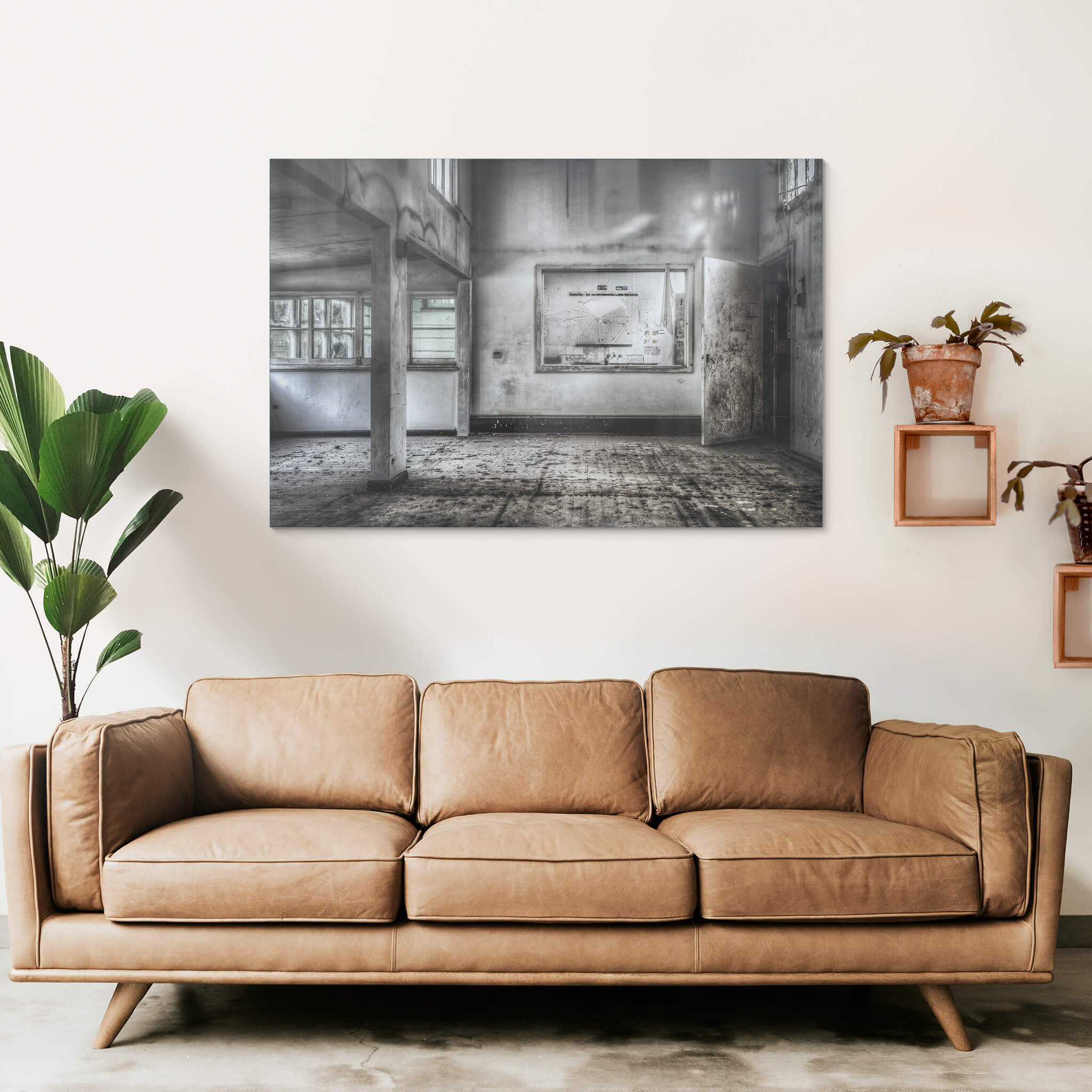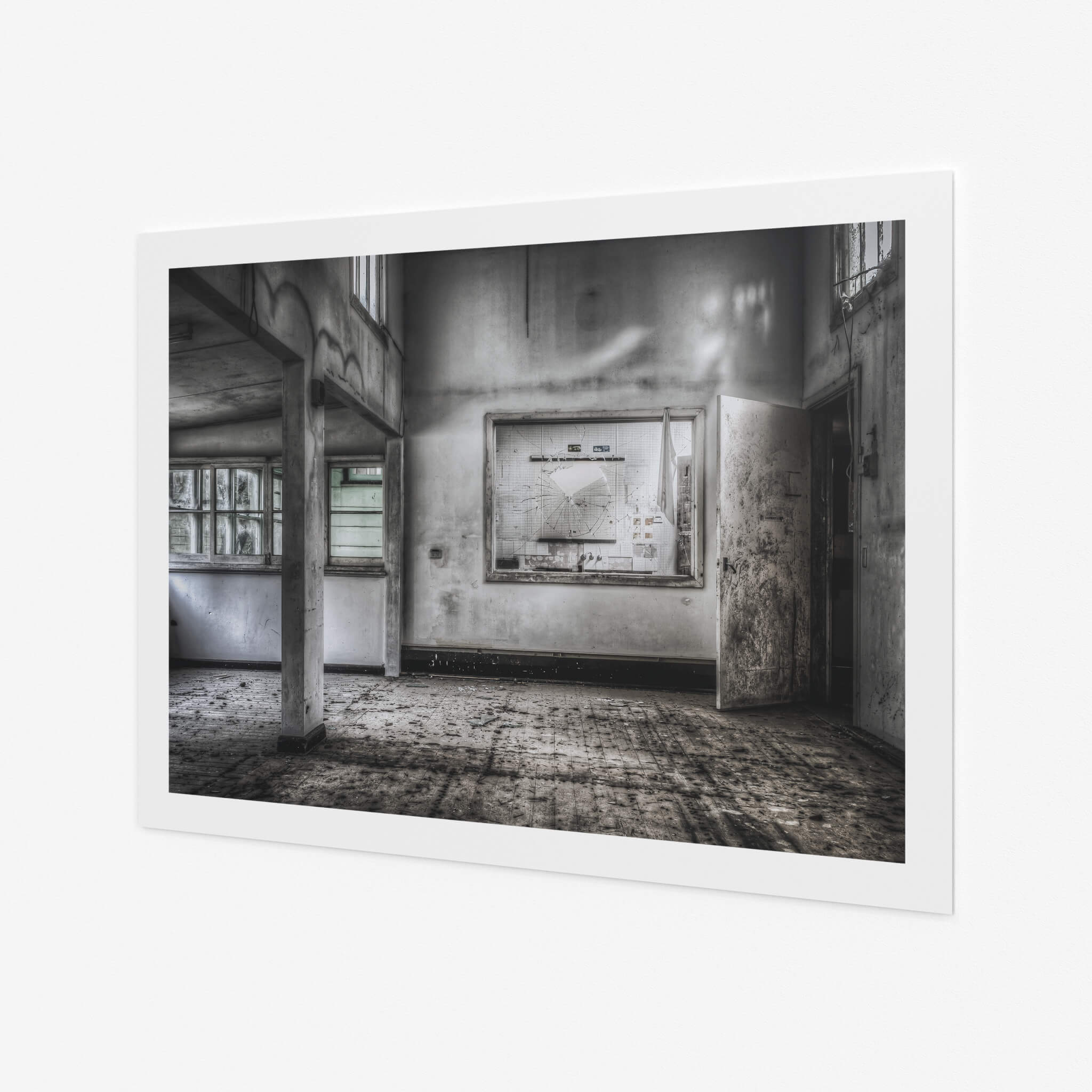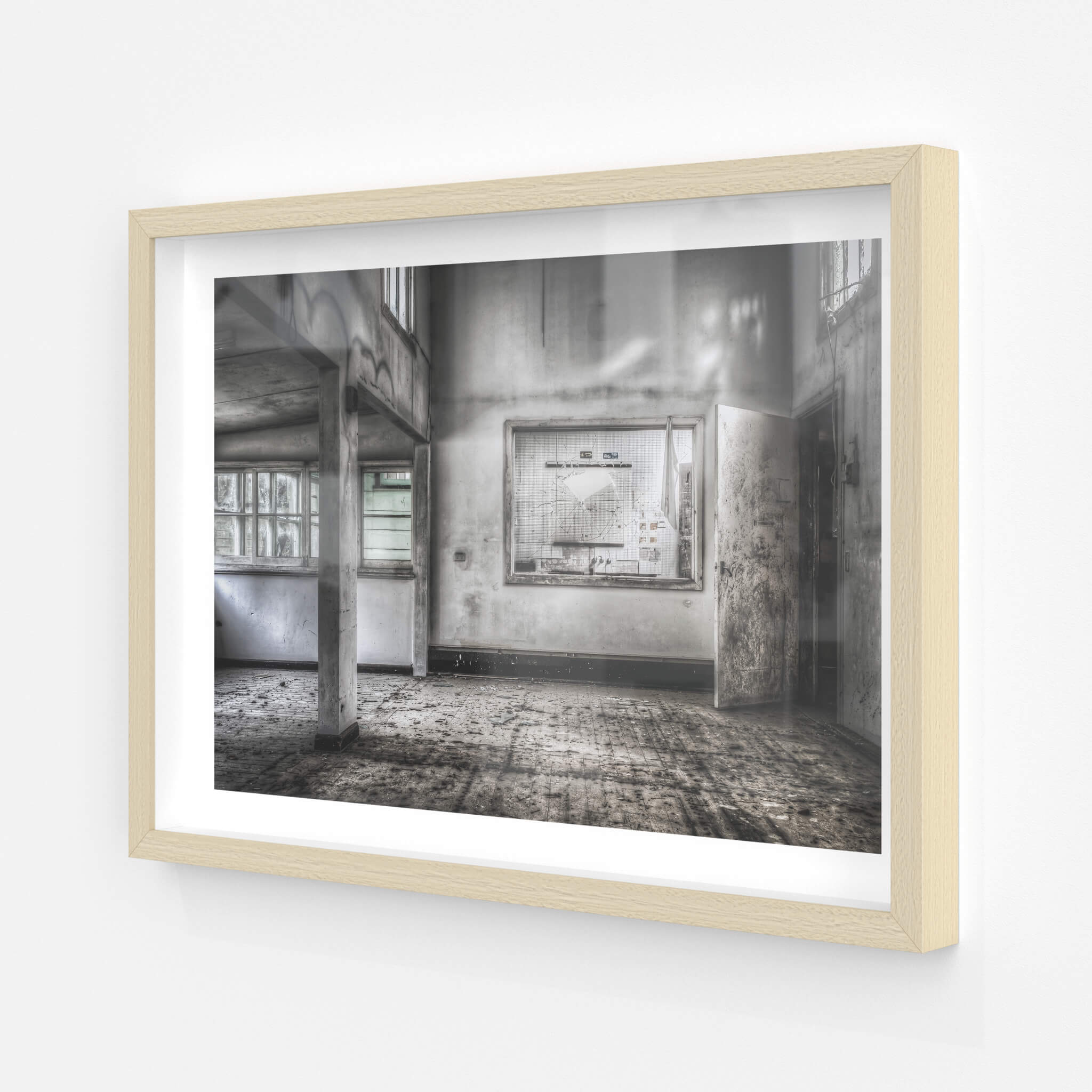 Glass print — 6mm toughened low-iron glass, bevelled edge, concealed mount.