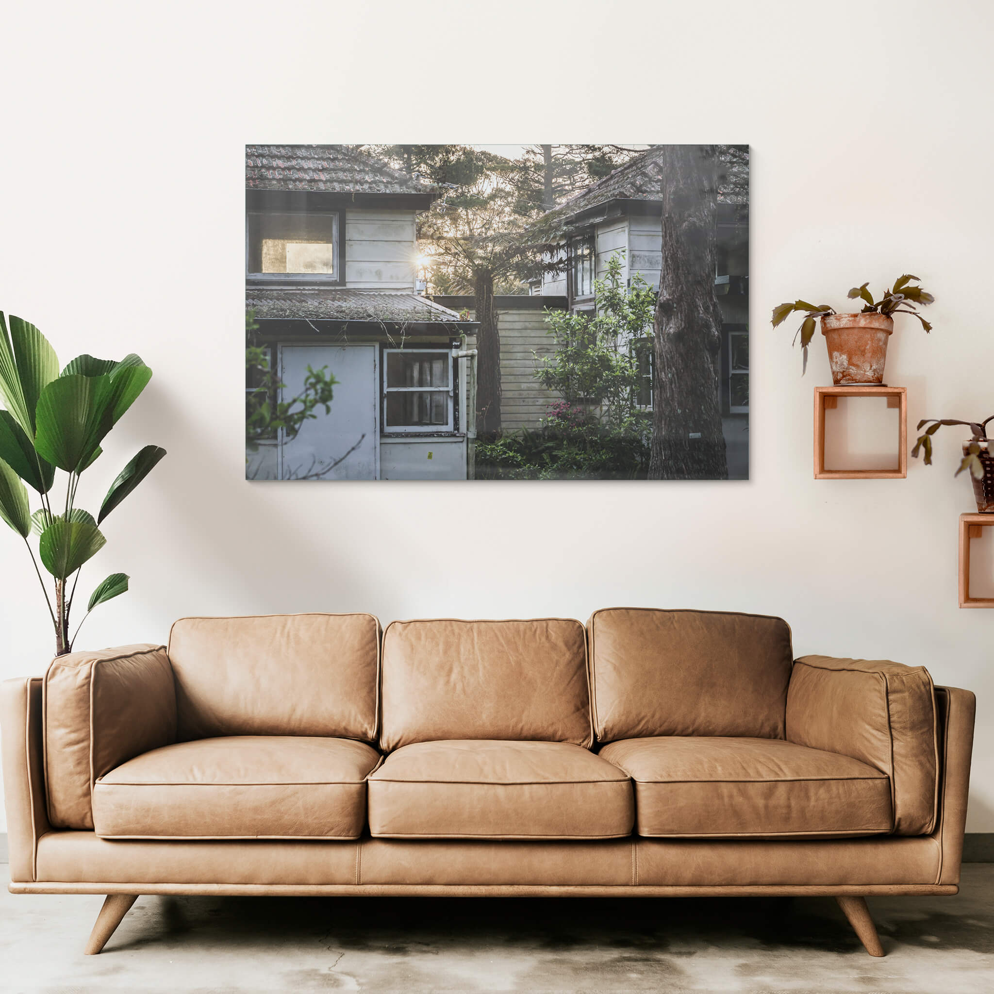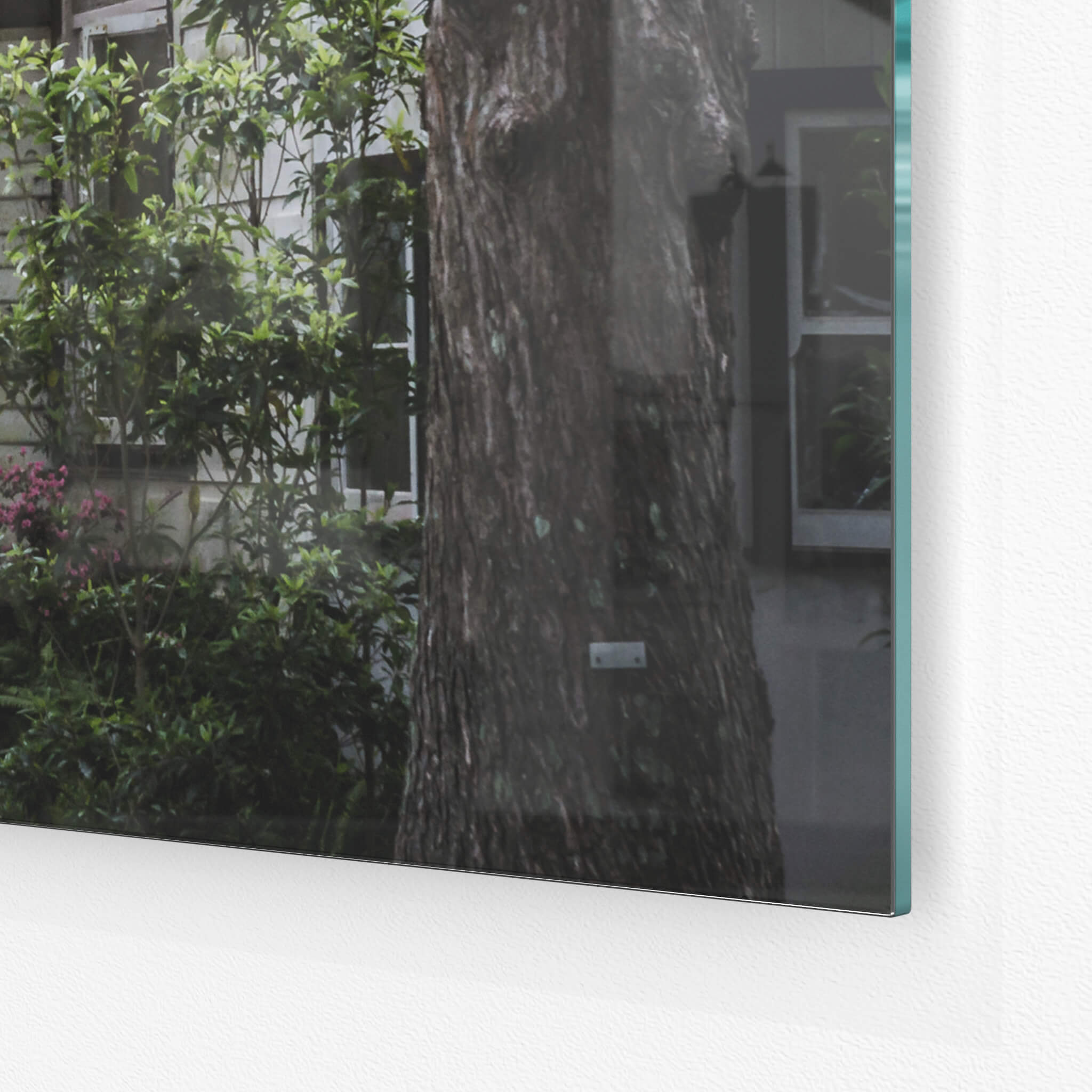 Glass print — 6mm toughened low-iron glass, bevelled edge, concealed mount.