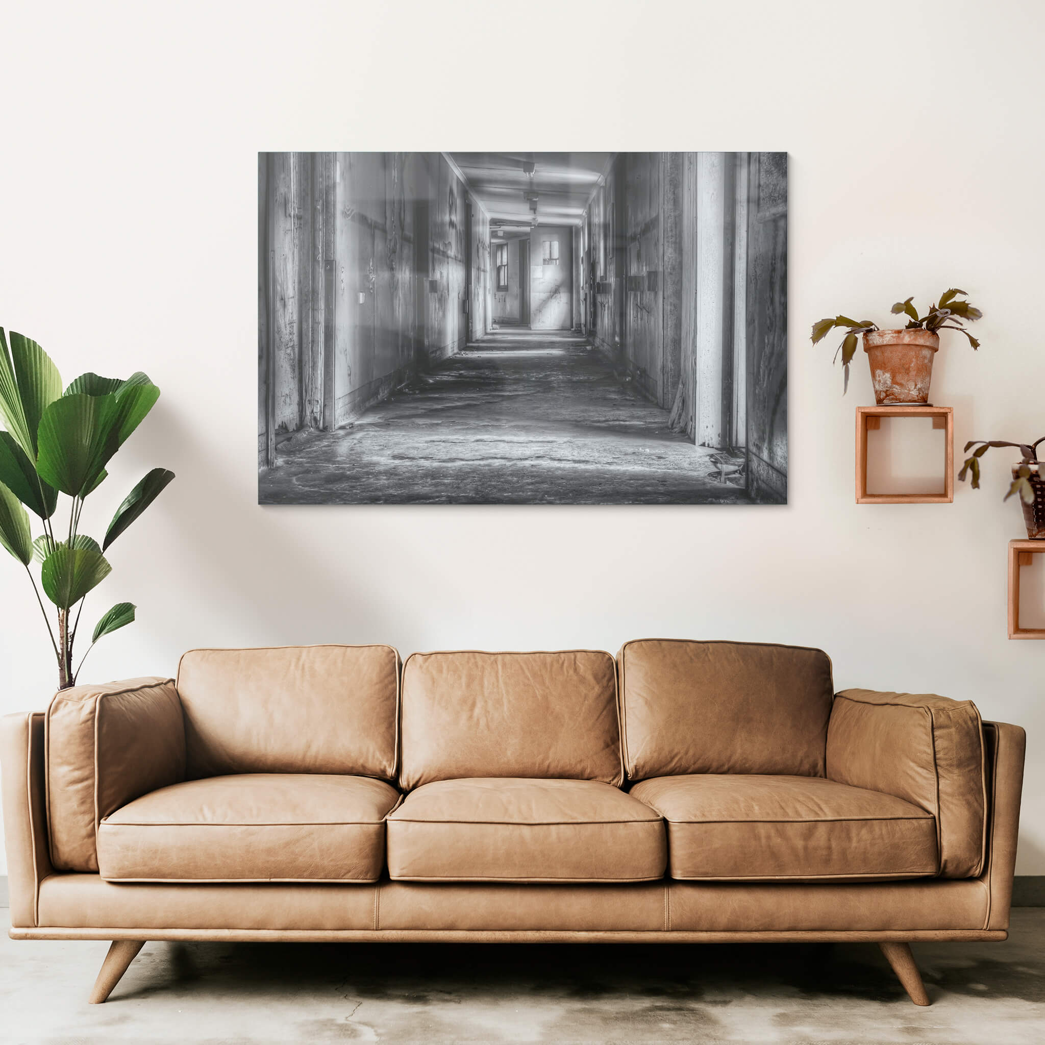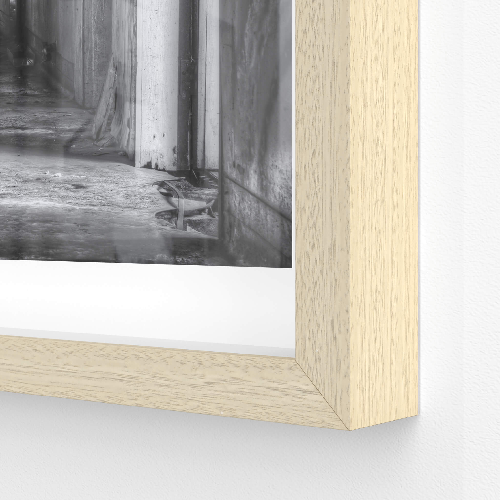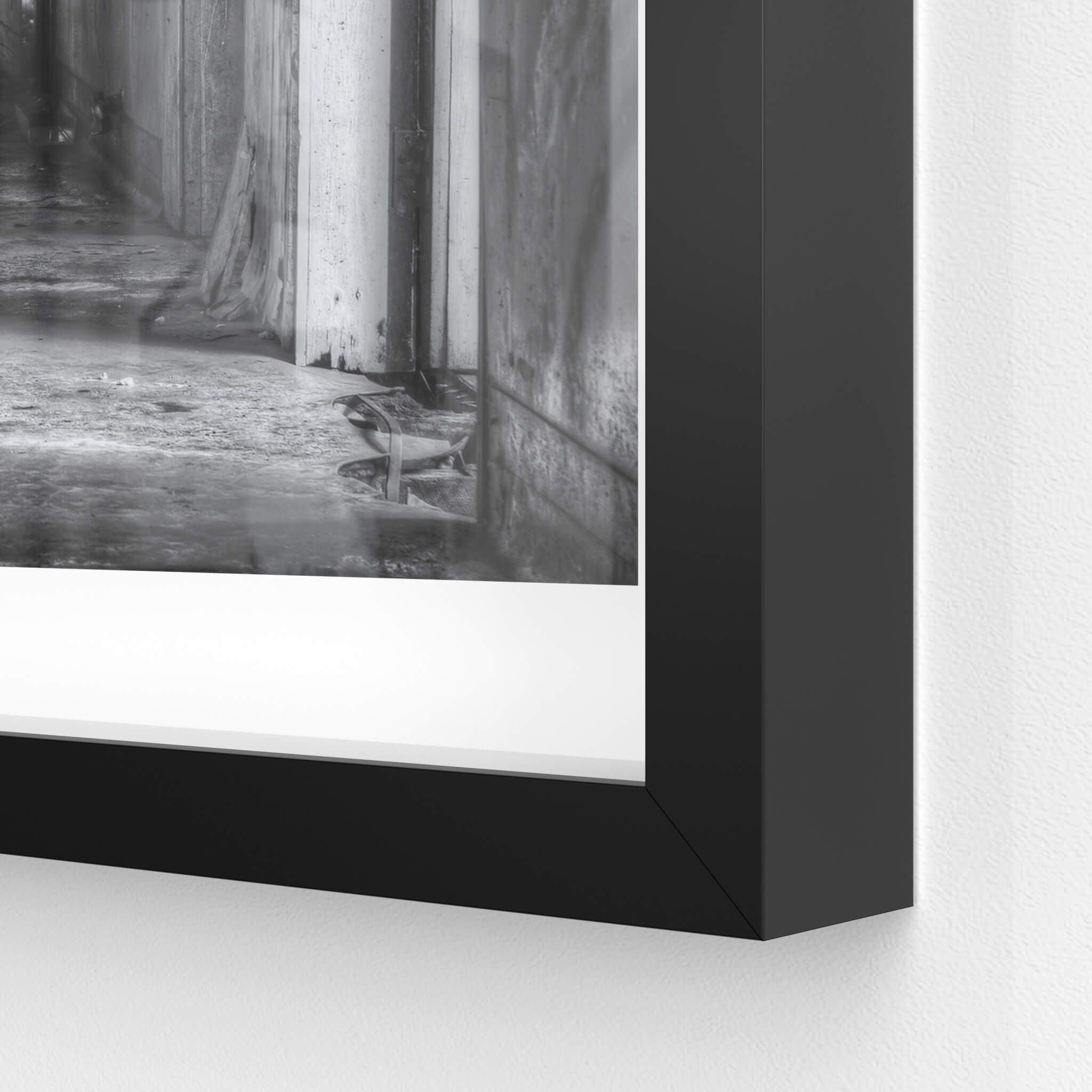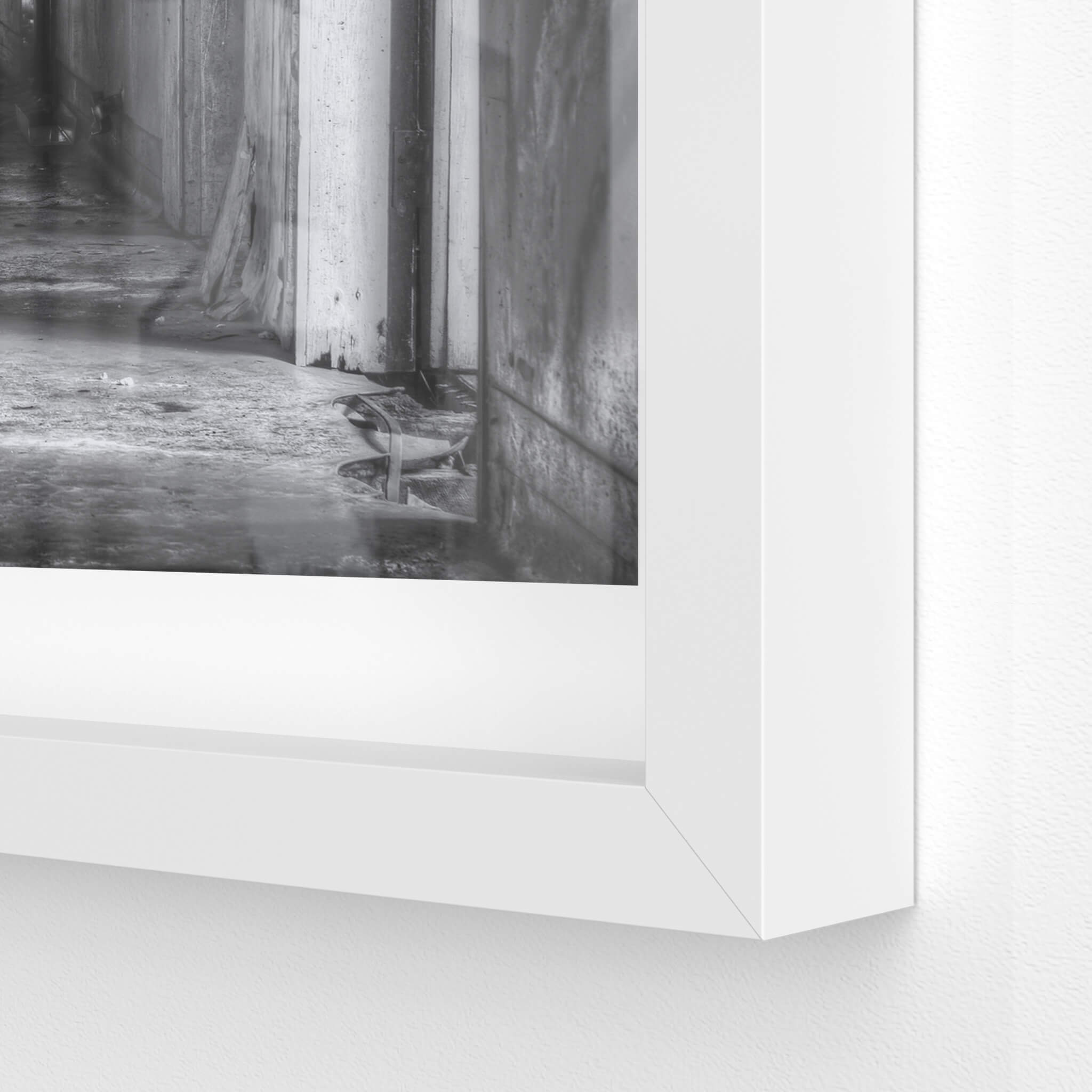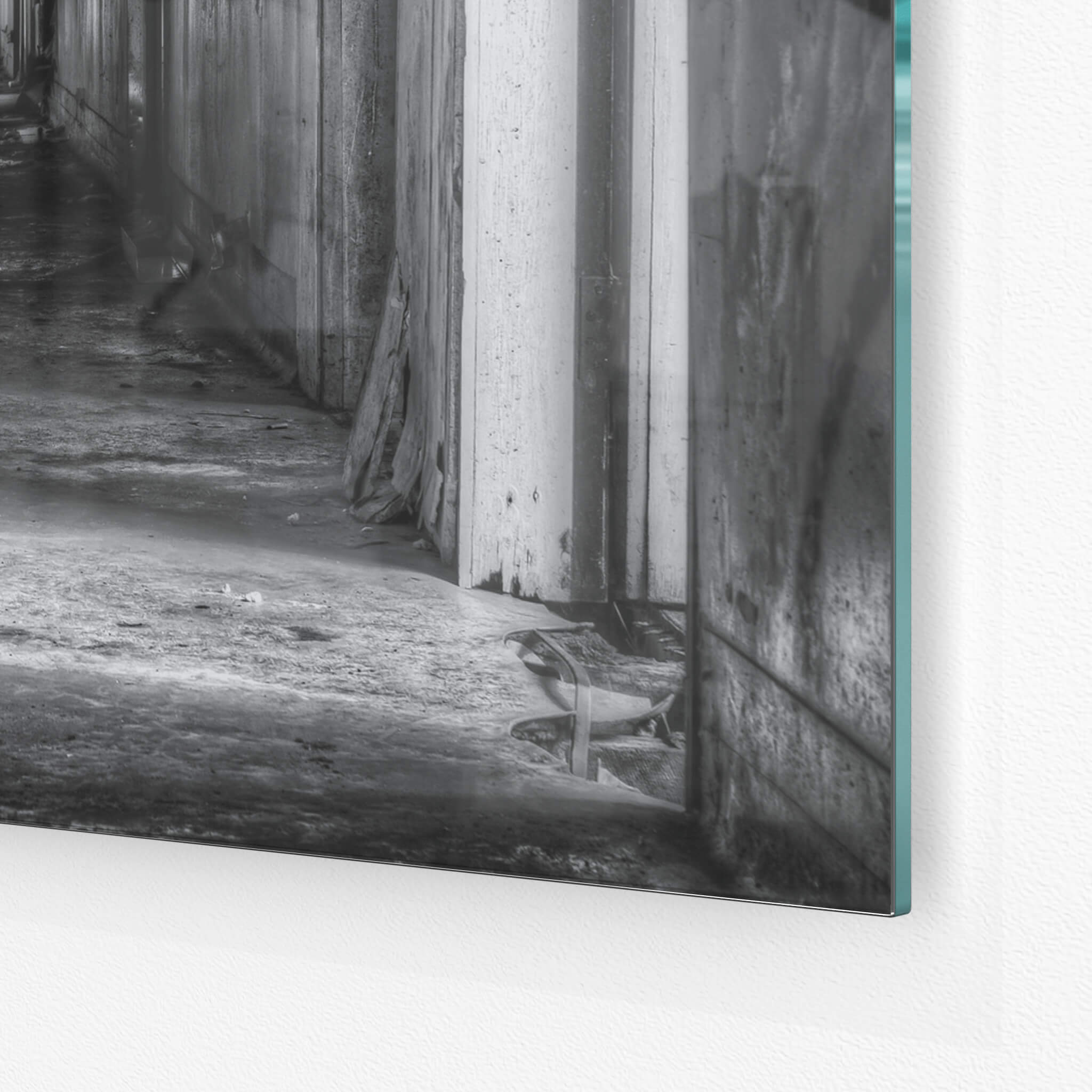 Glass print — 6mm toughened low-iron glass, bevelled edge, concealed mount.