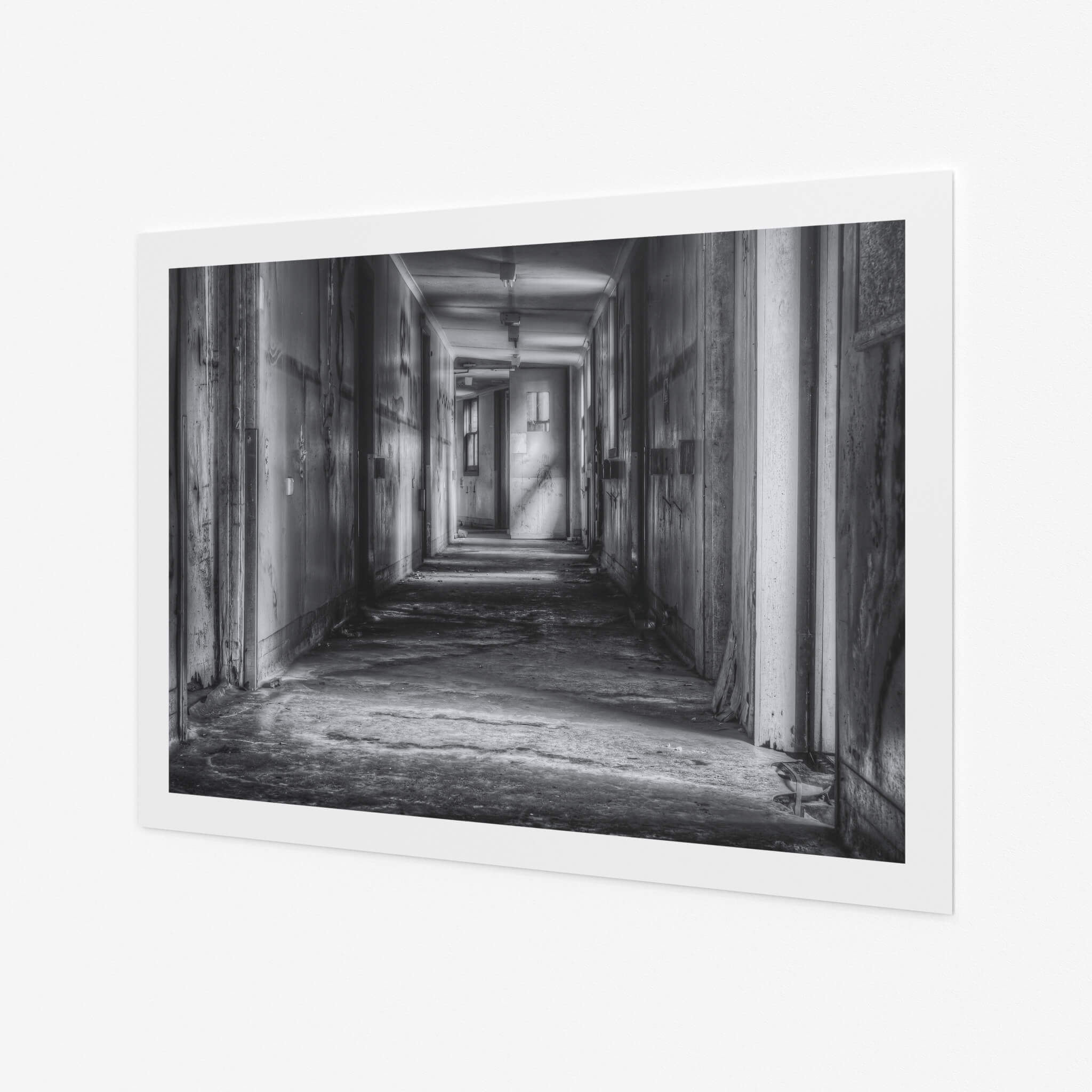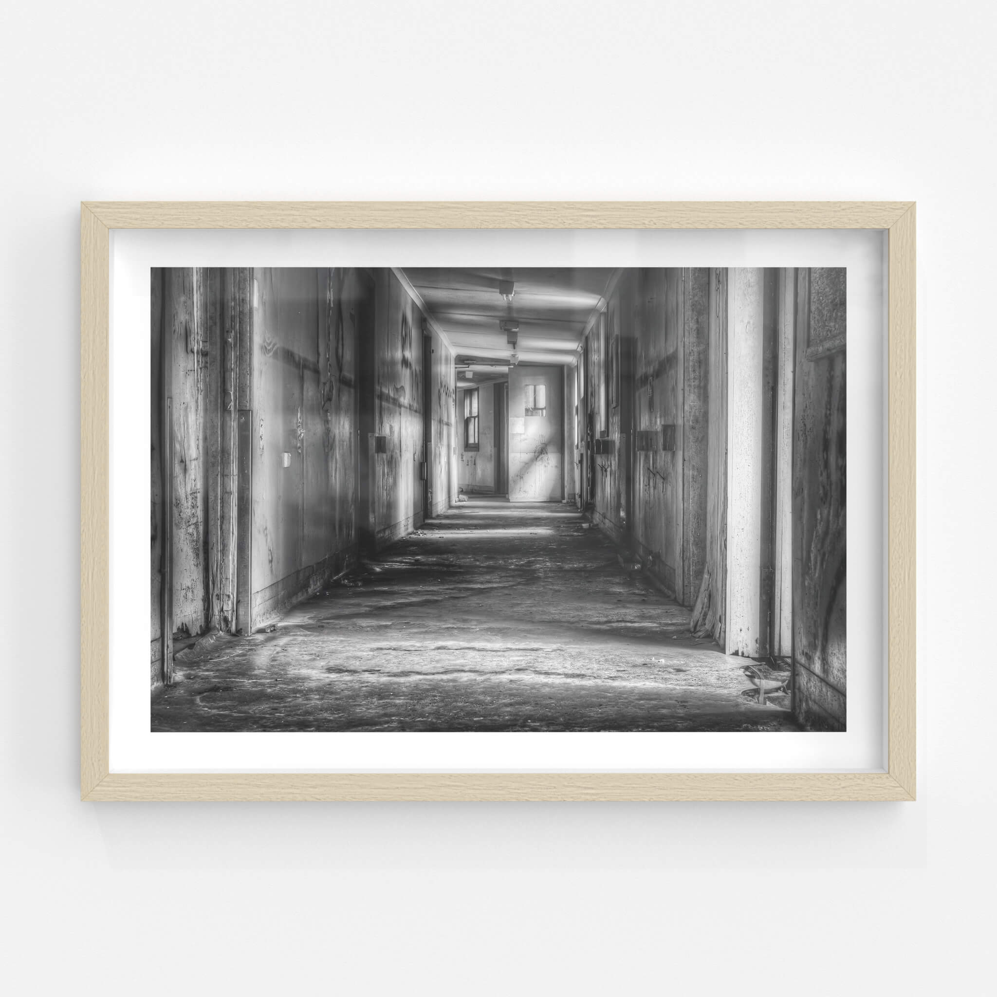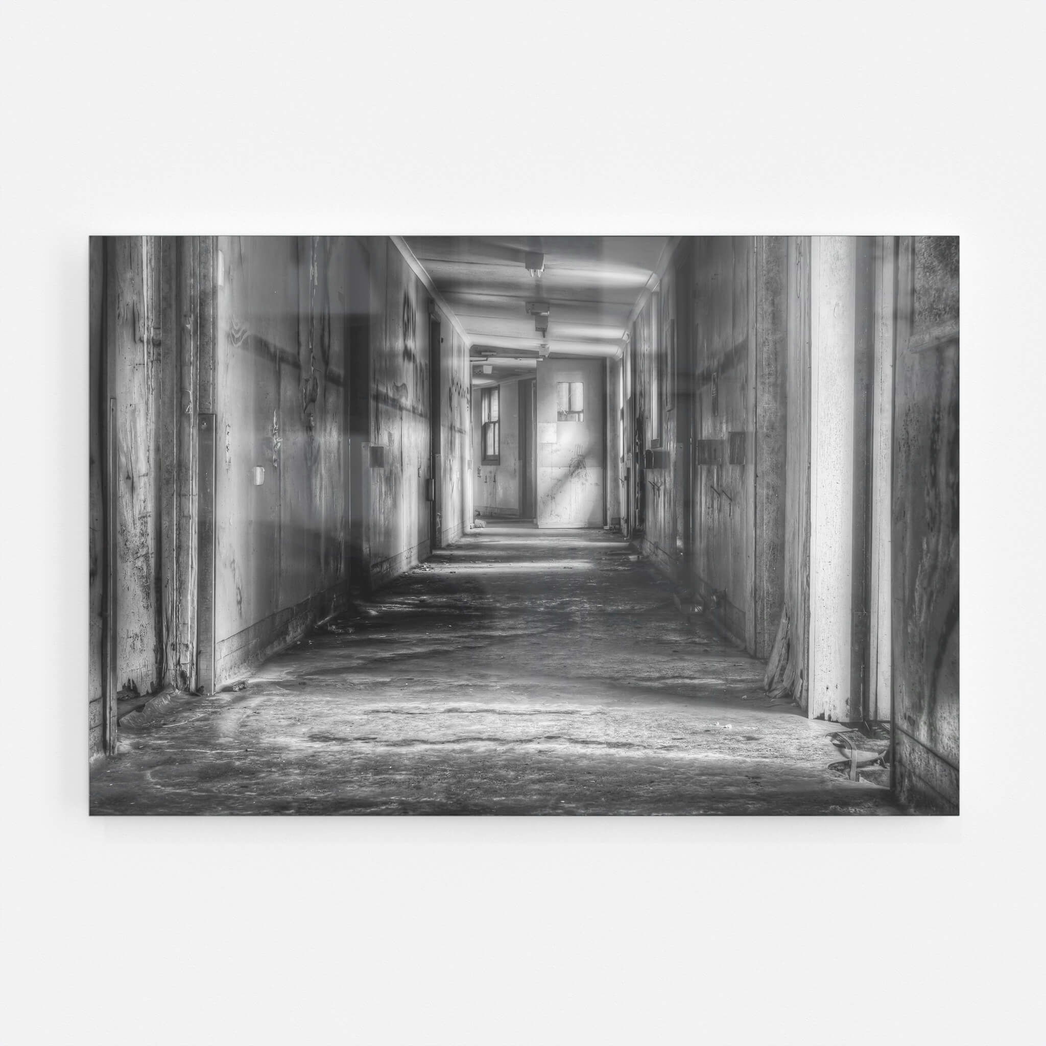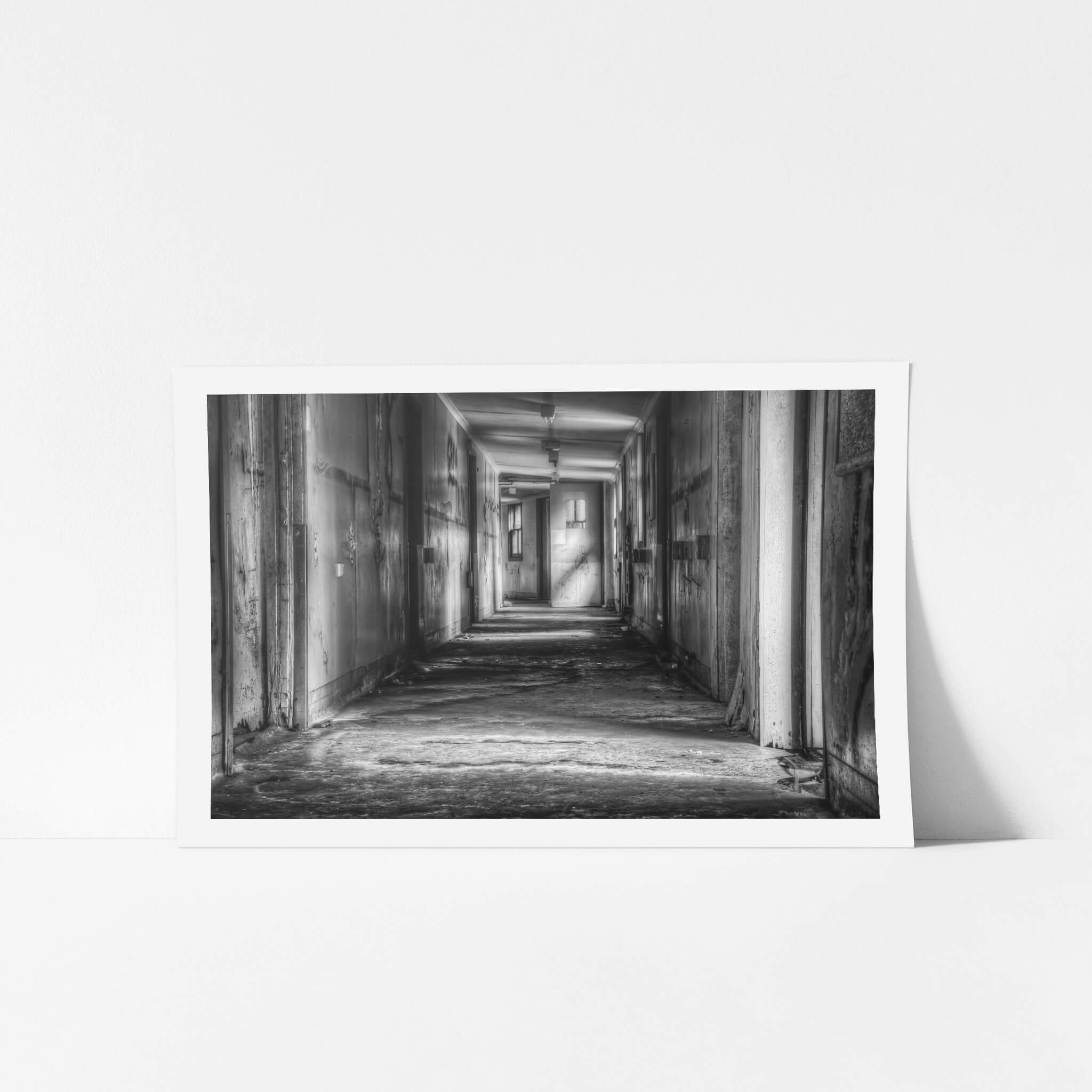 A long, silent hallway stretches through the decaying Queen Victoria Sanitorium. Faded paint peels from the walls, revealing layers of past colours. Light filters through distant windows, illuminating dust motes in the still air.