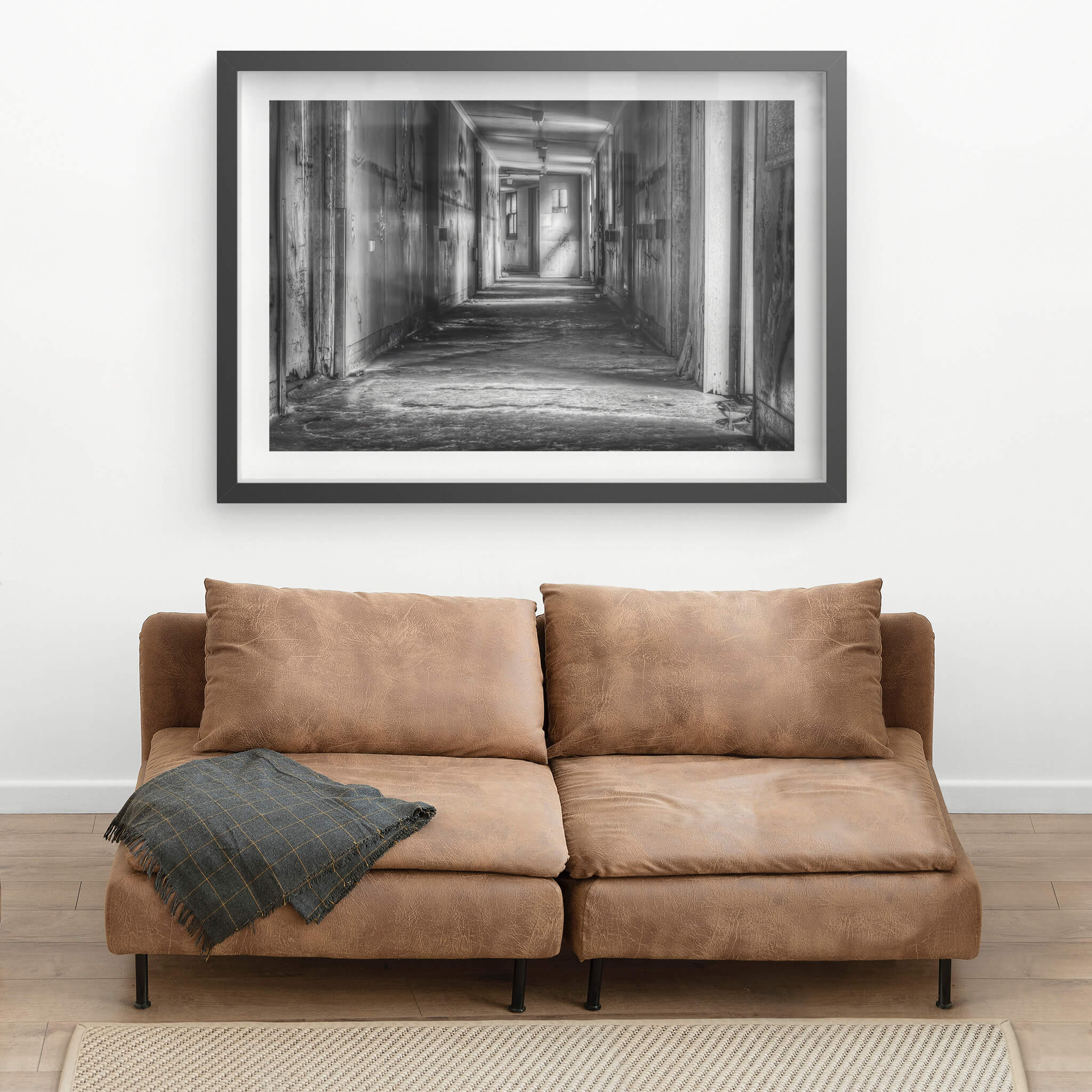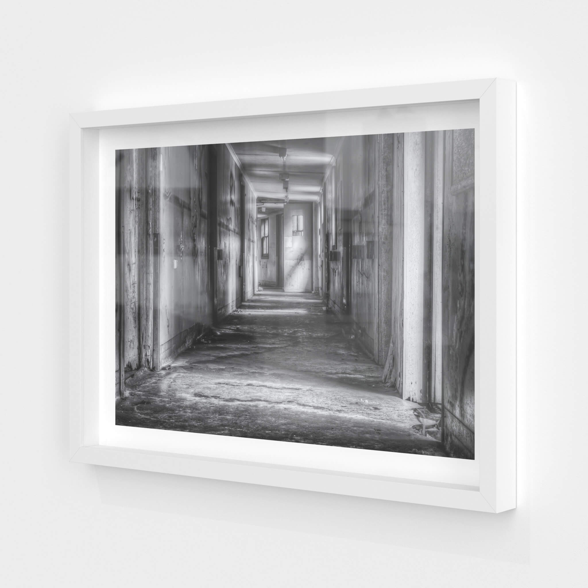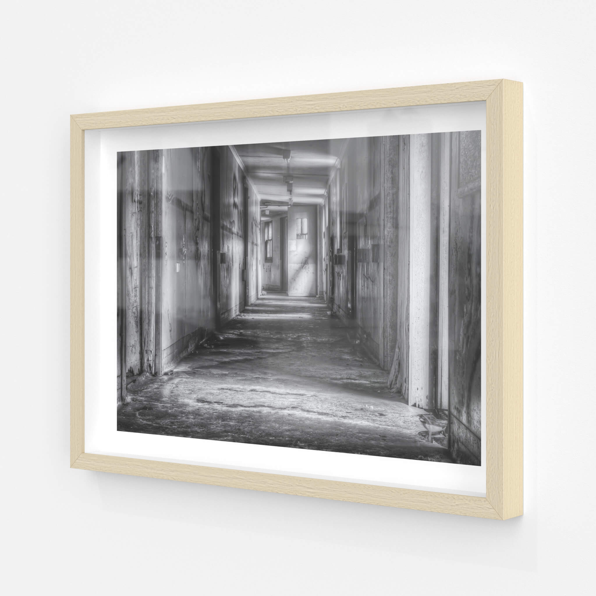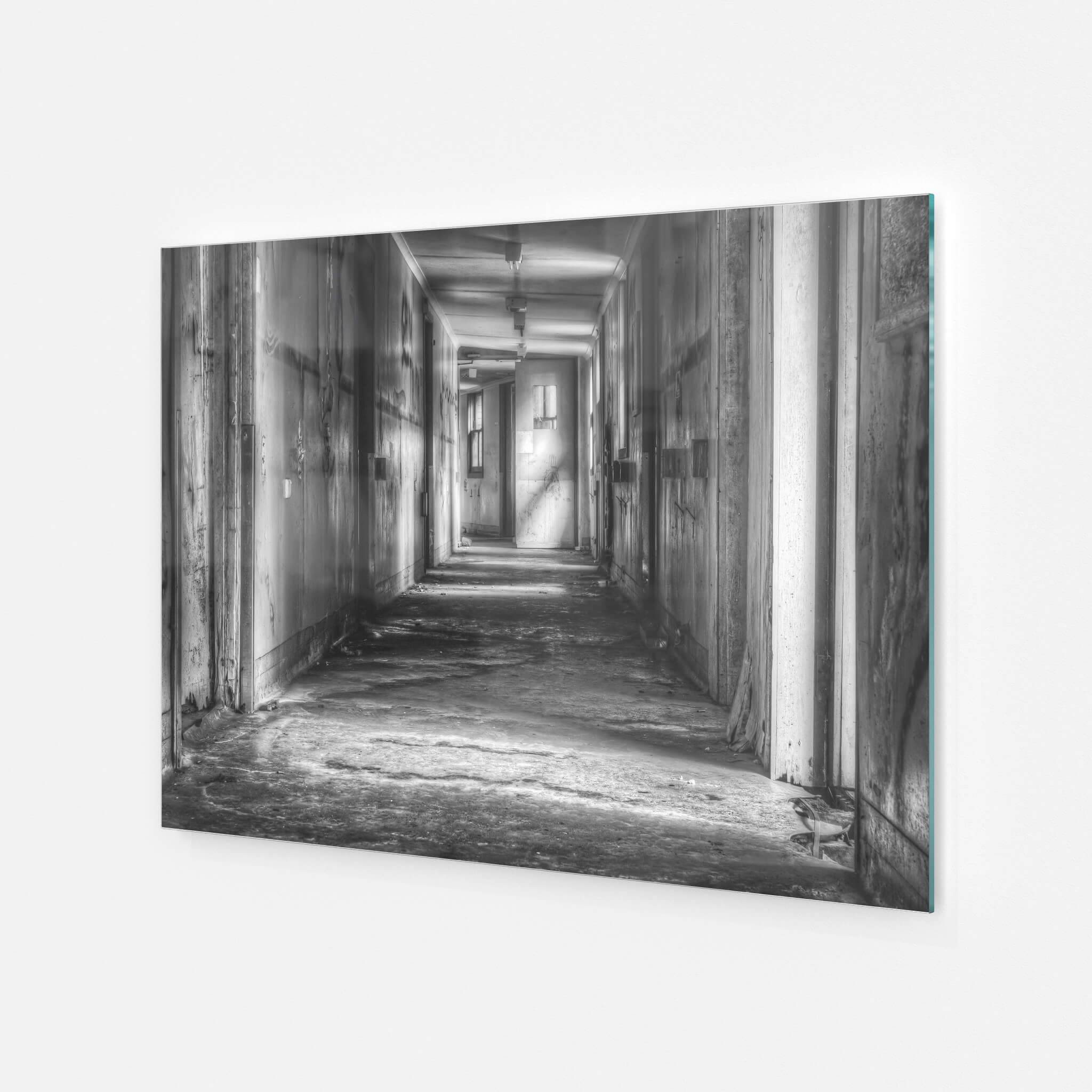 A long, silent hallway stretches through the decaying Queen Victoria Sanitorium. Faded paint peels from the walls, revealing layers of past colours. Light filters through distant windows, illuminating dust motes in the still air.