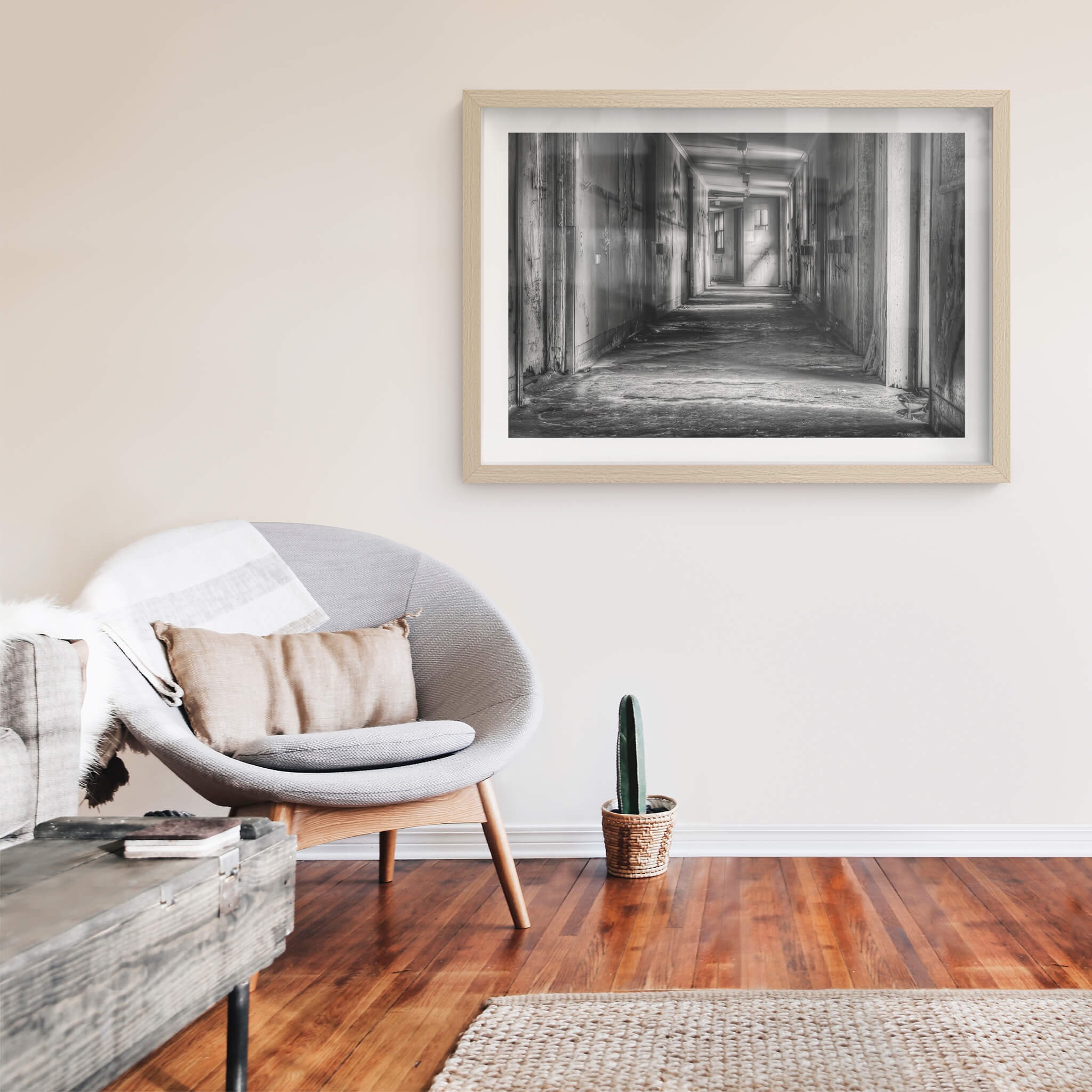 Framed — sustainably sourced timber in raw, white, or black finish.