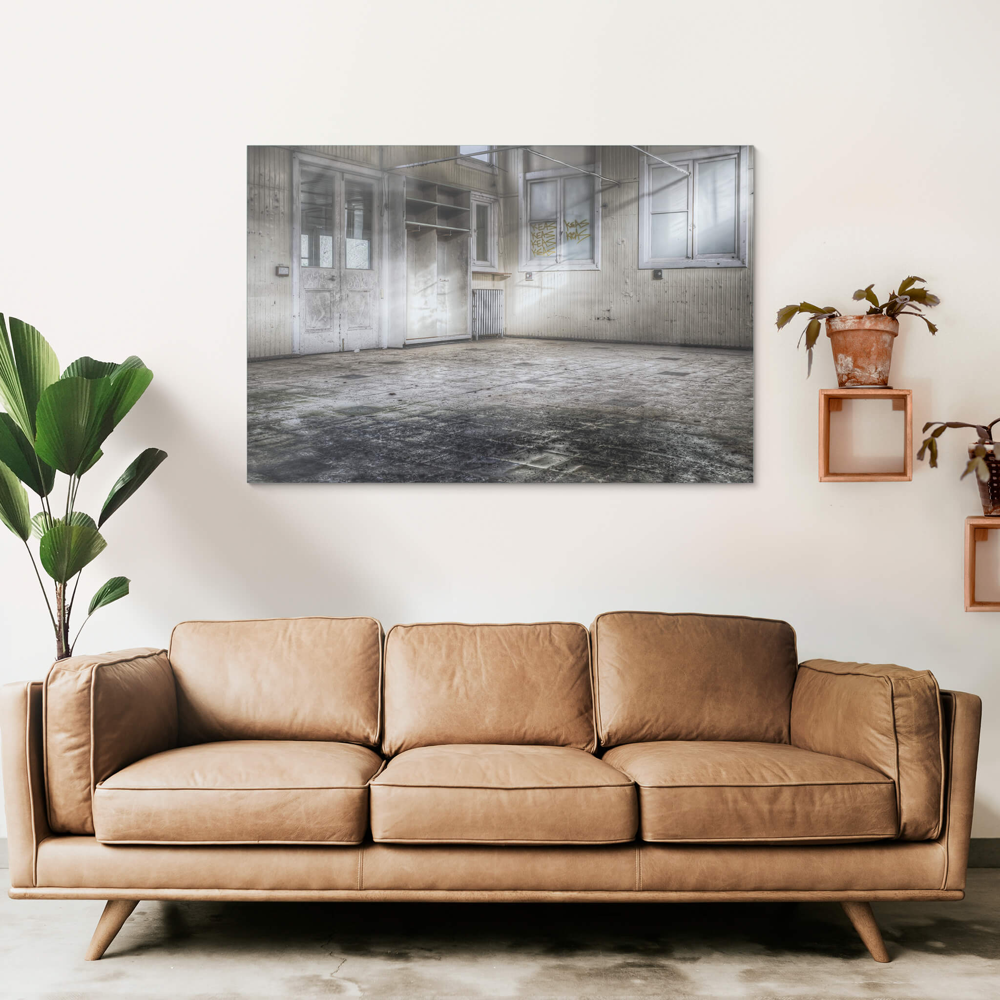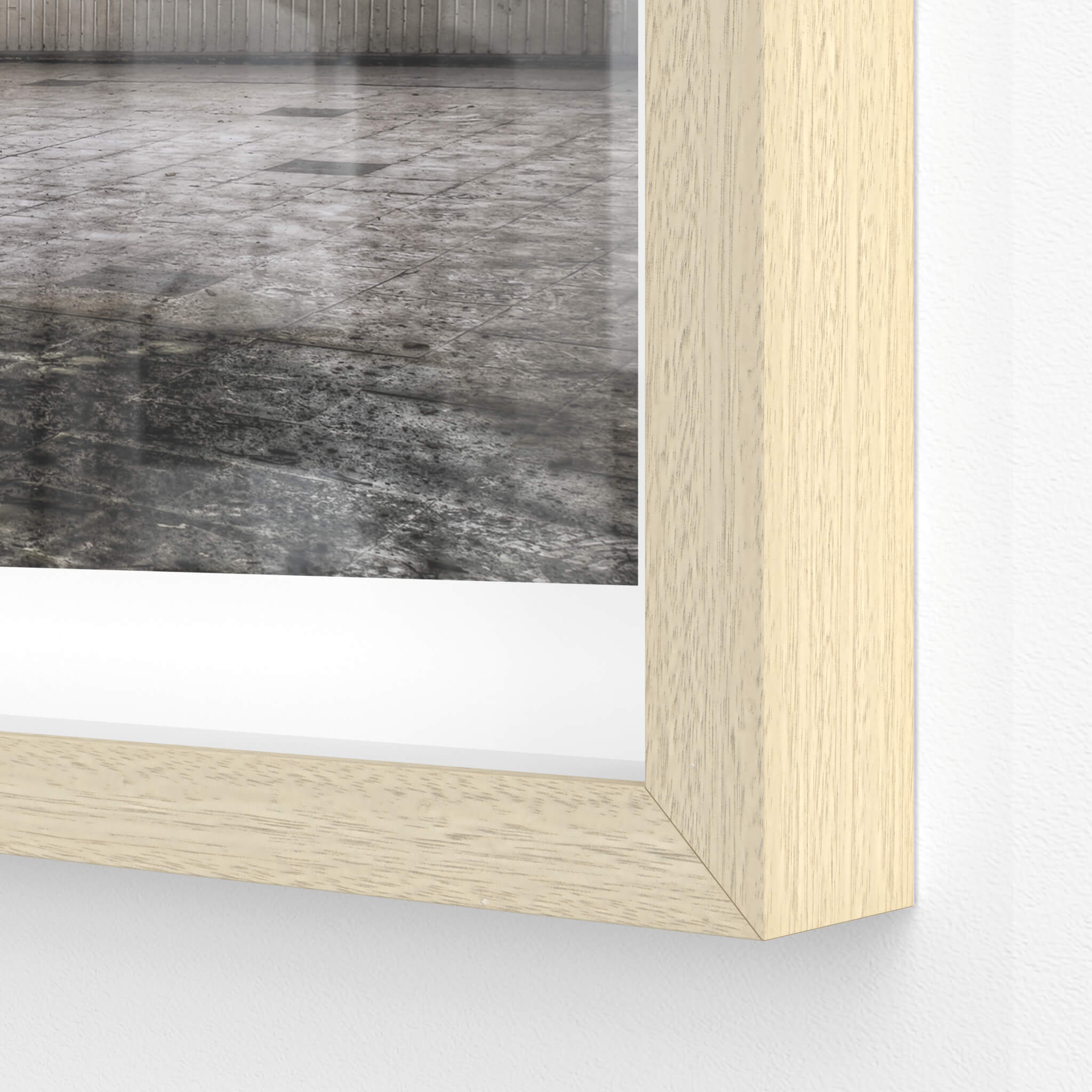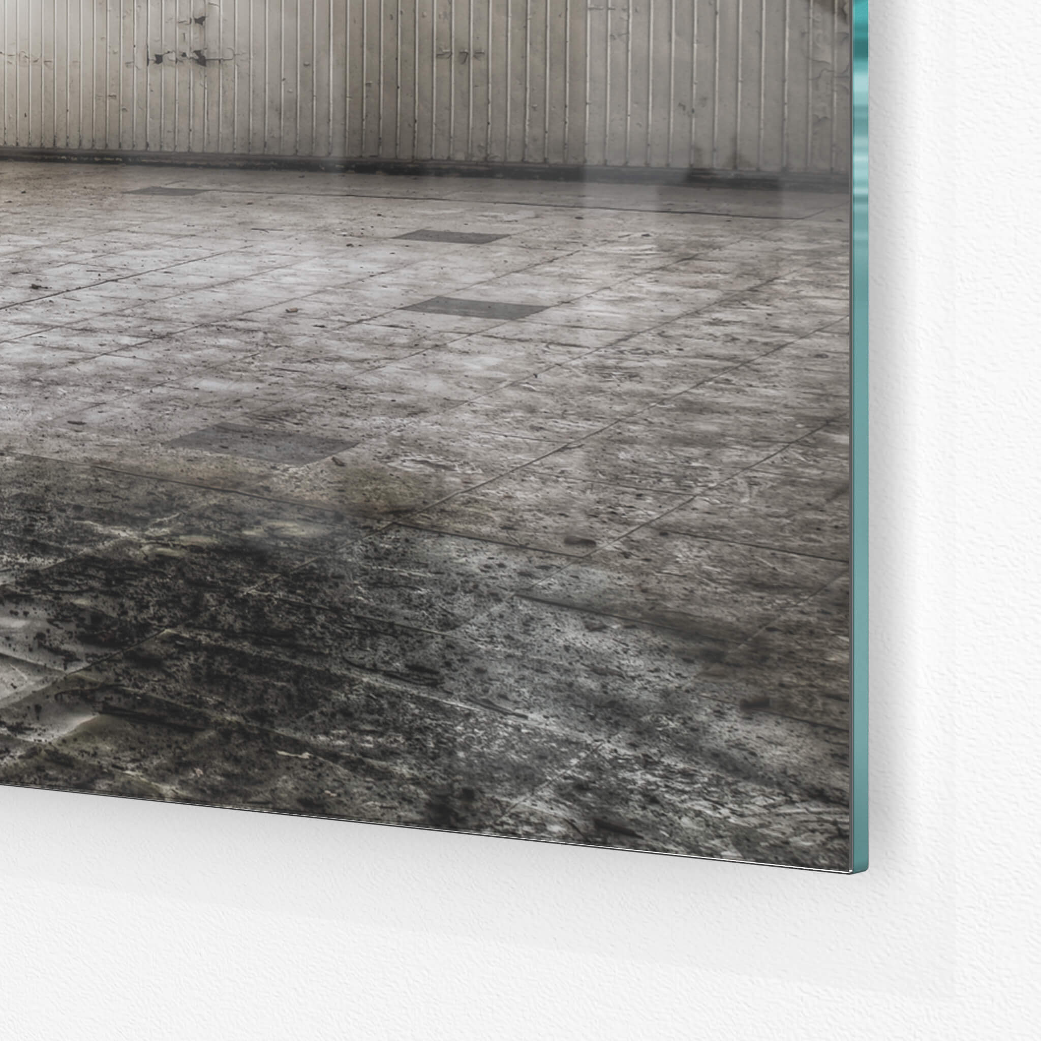 Glass print — 6mm toughened low-iron glass, bevelled edge, concealed mount.