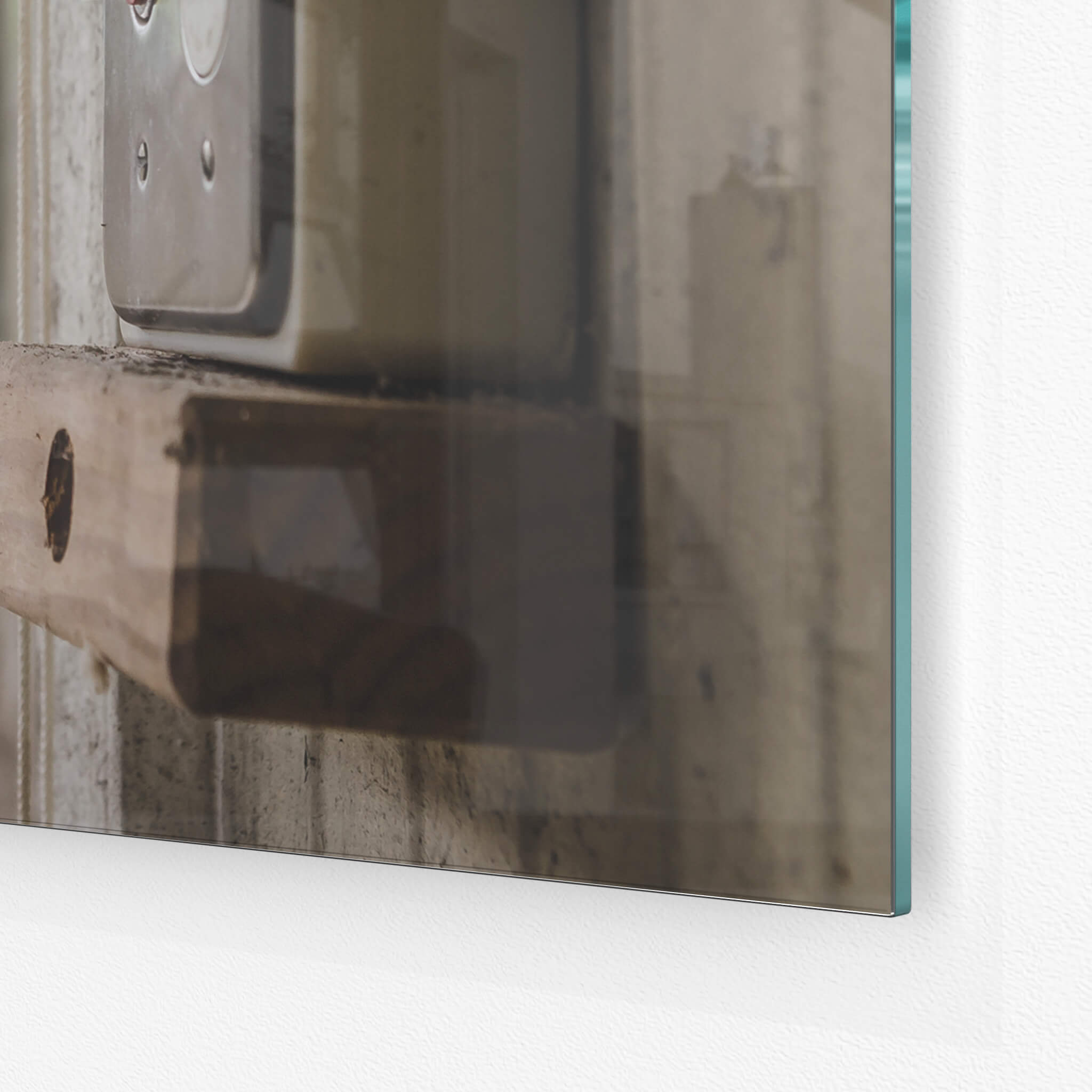 Glass print — 6mm toughened low-iron glass, bevelled edge, concealed mount.