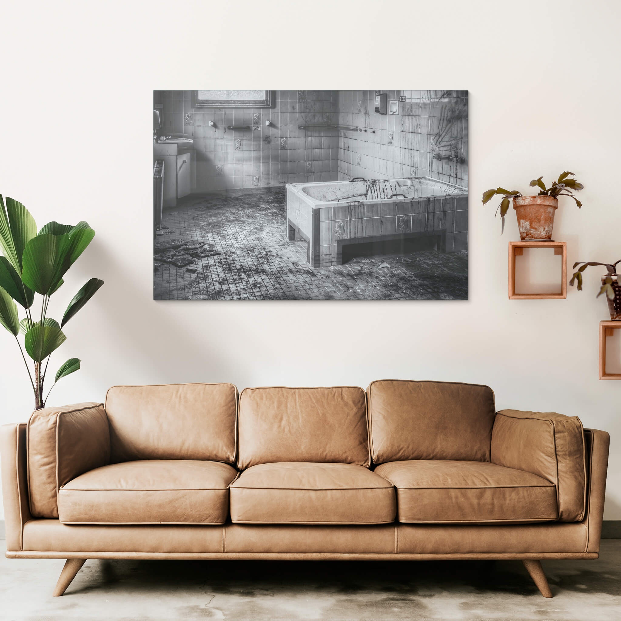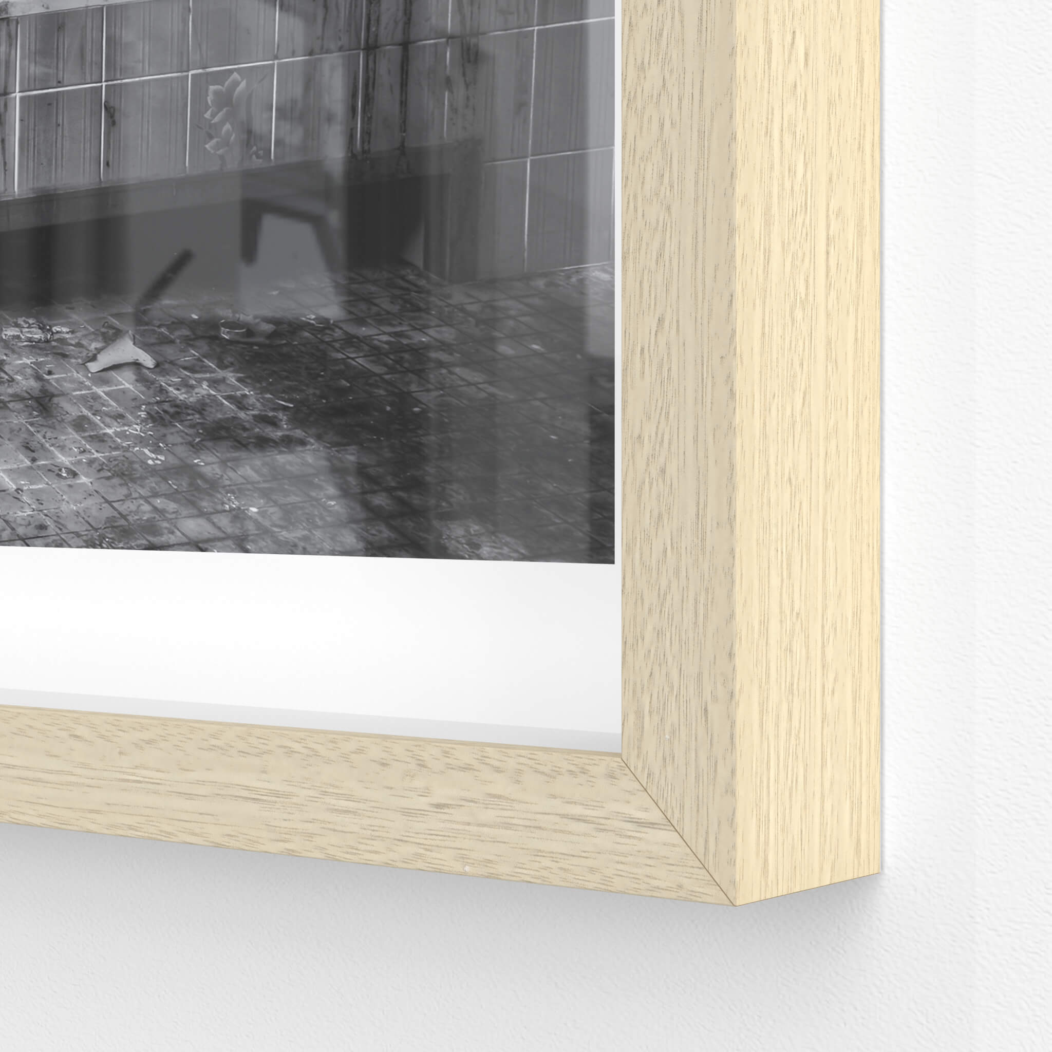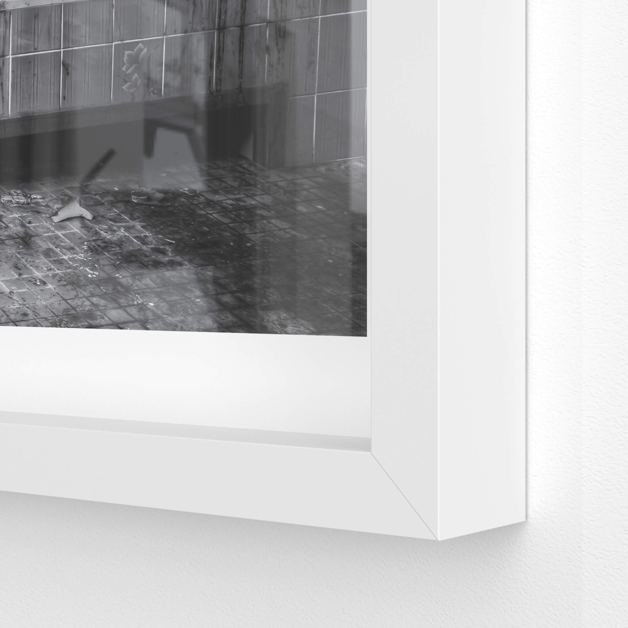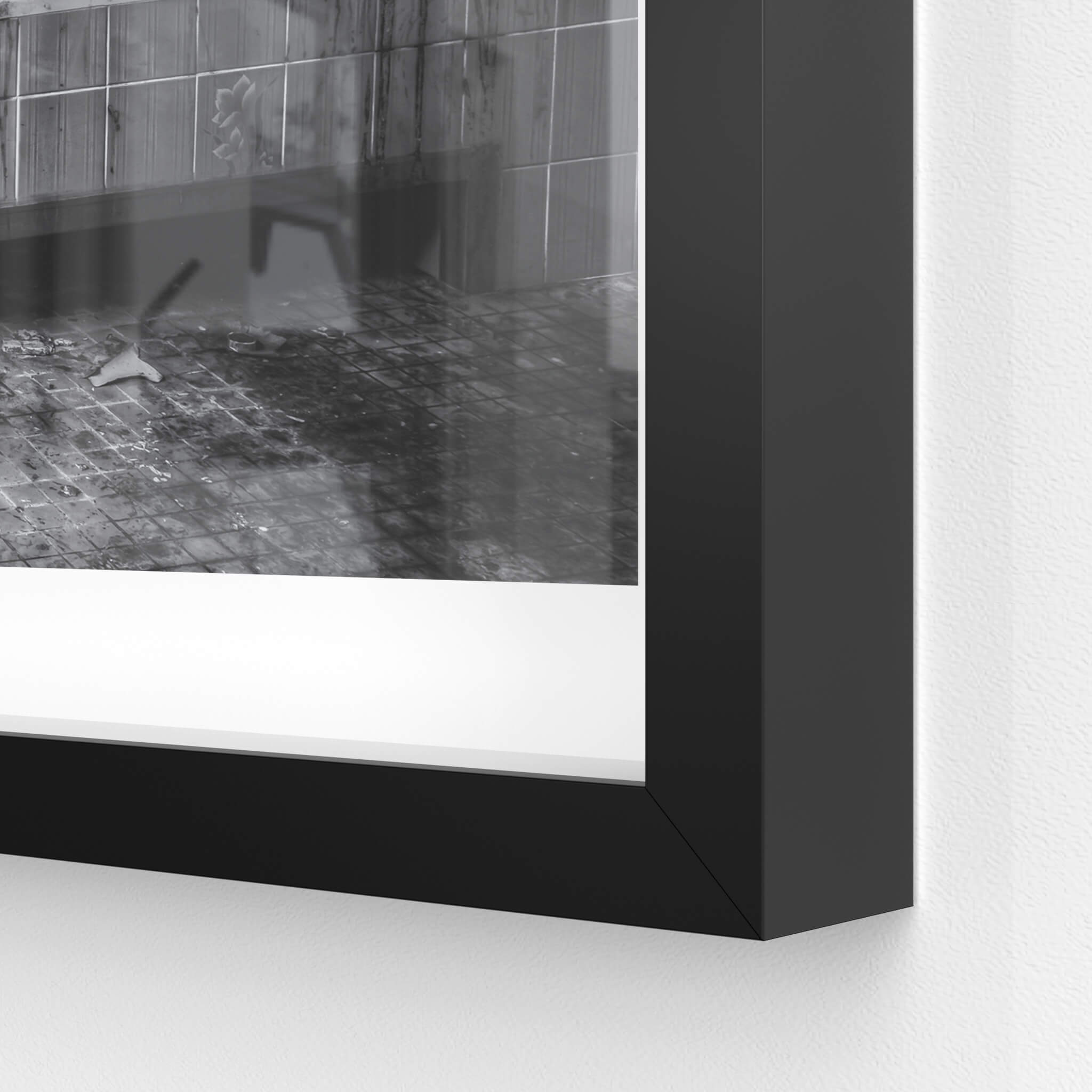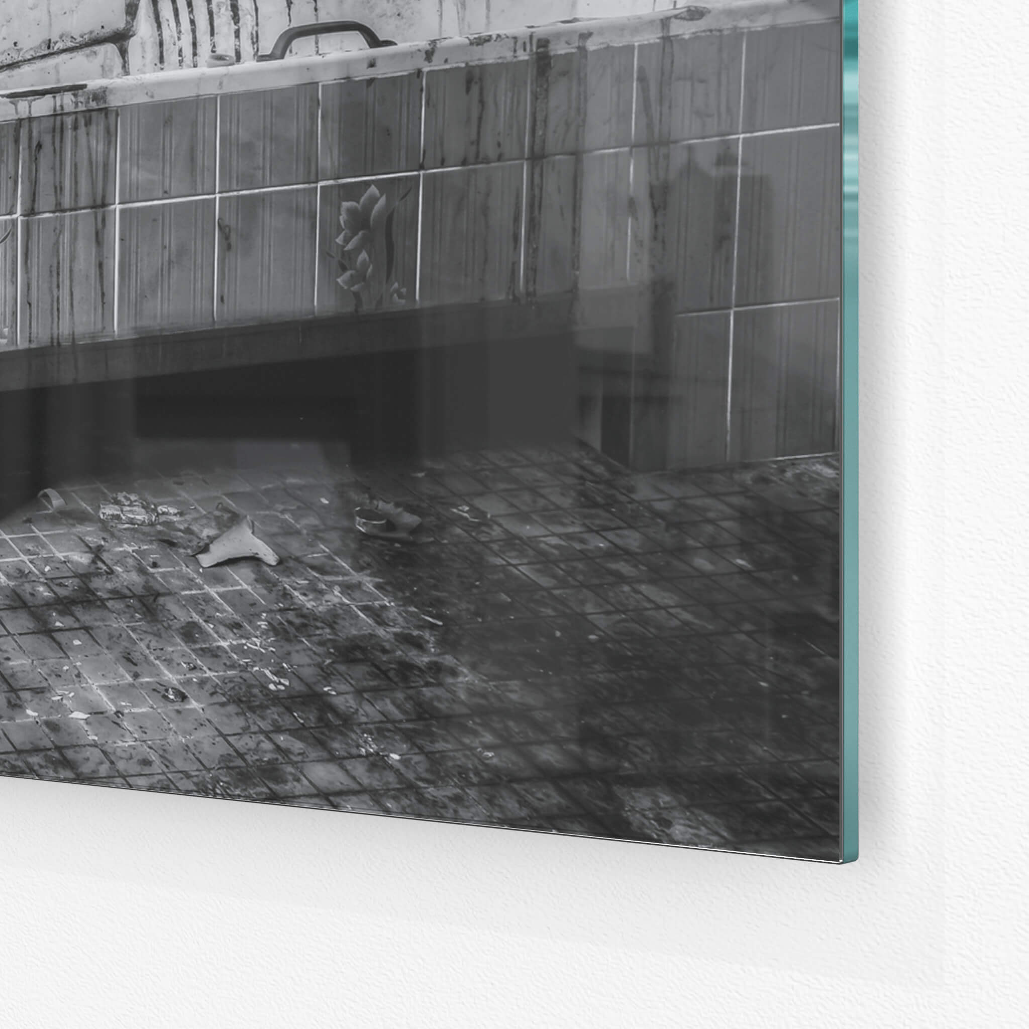 Glass print — 6mm toughened low-iron glass, bevelled edge, concealed mount.