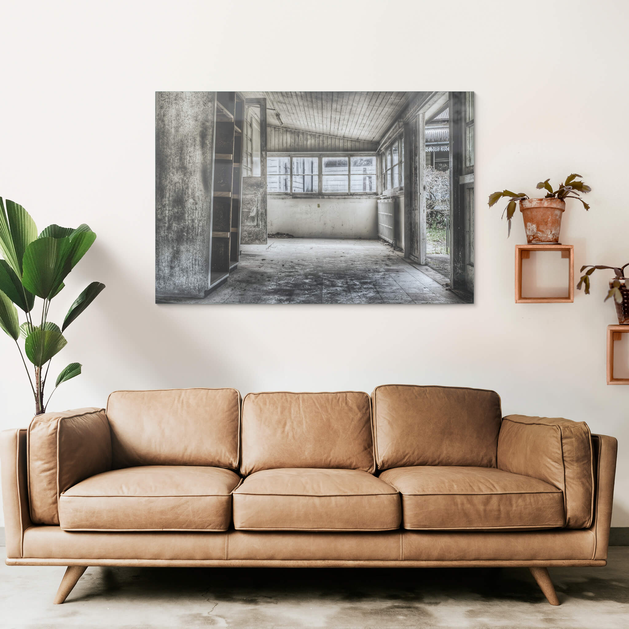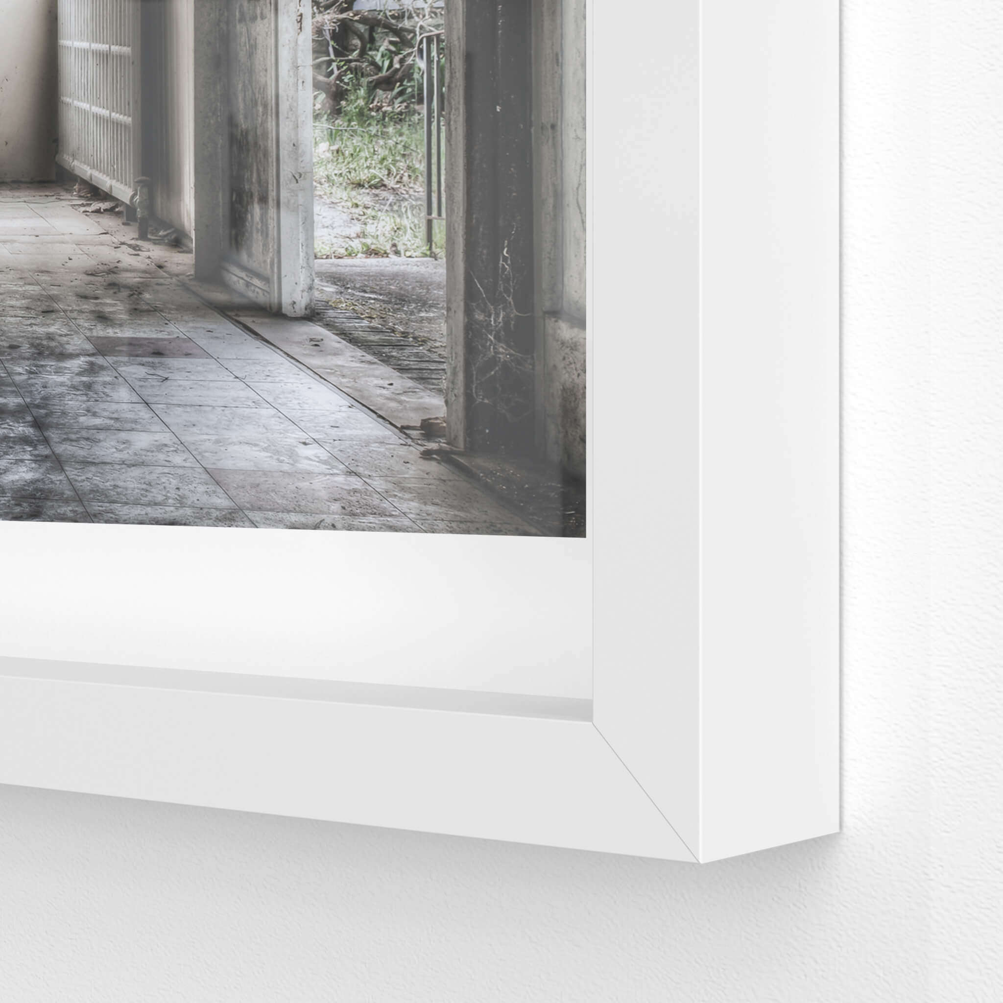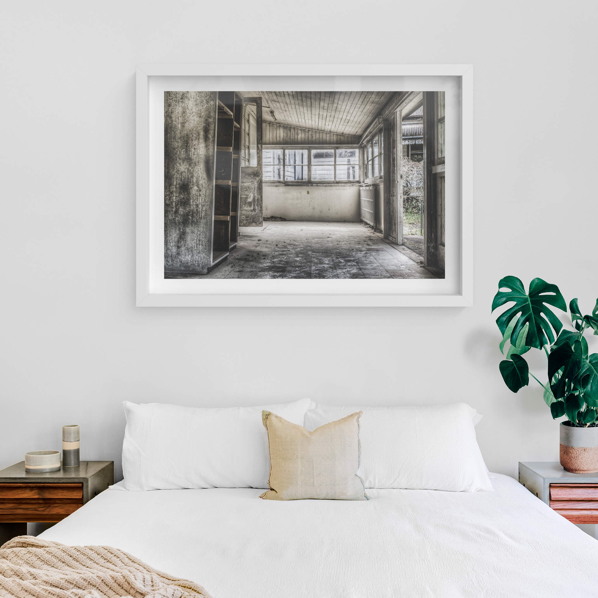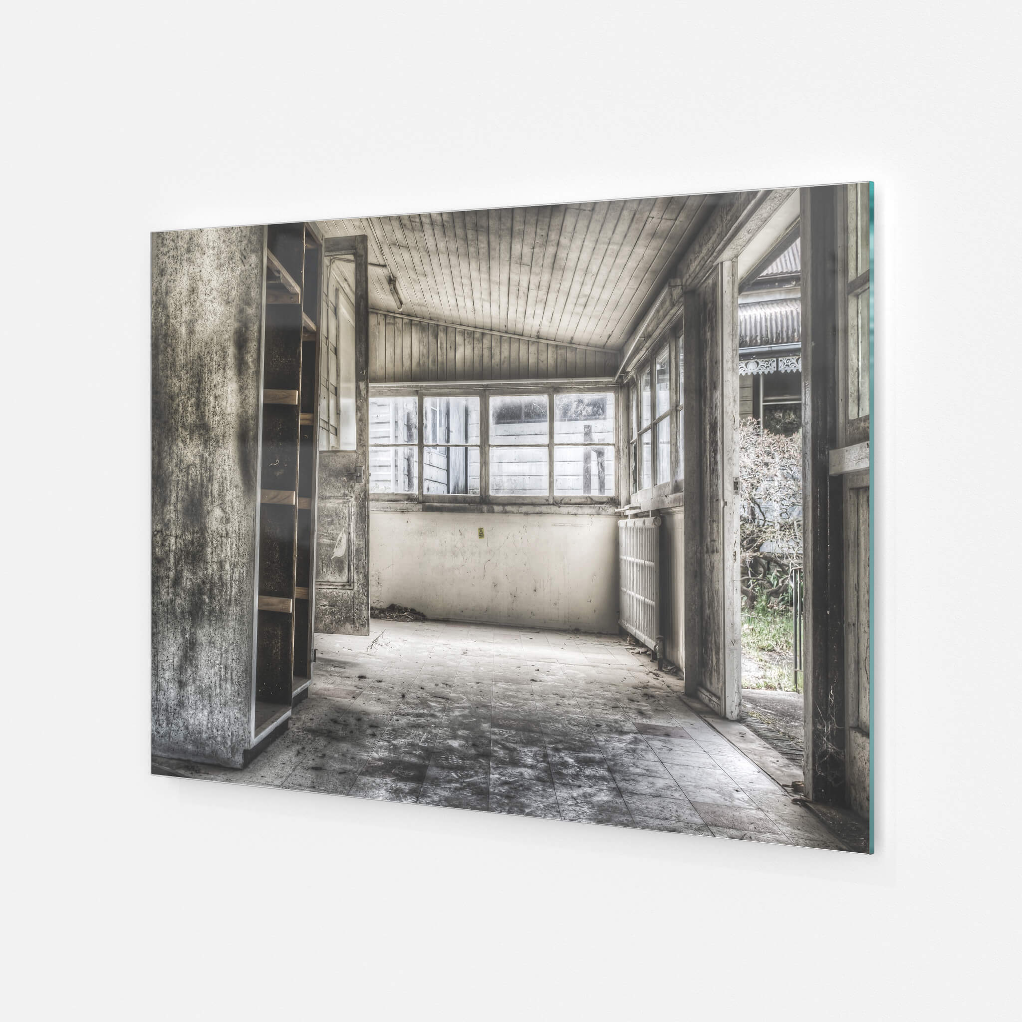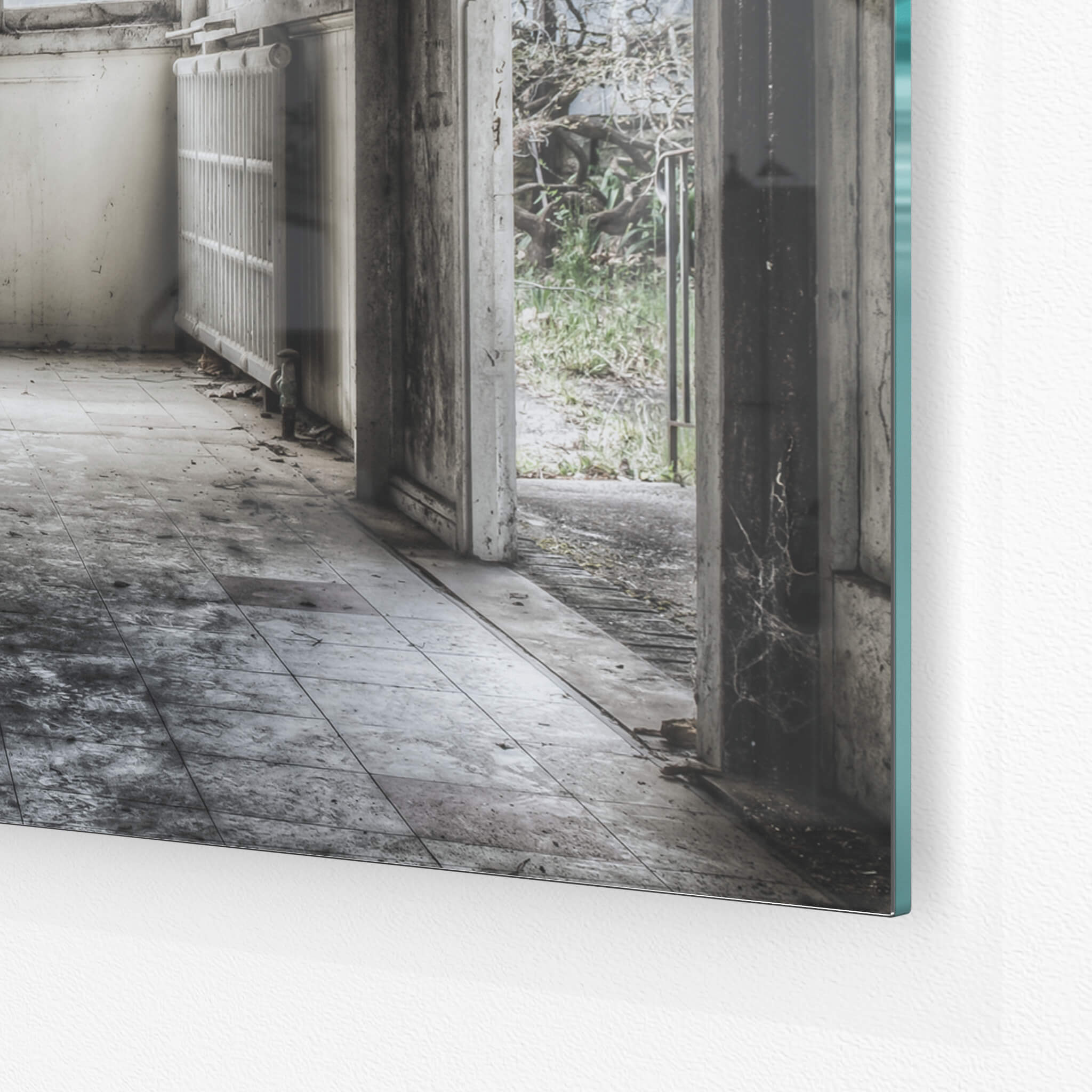 Glass print — 6mm toughened low-iron glass, bevelled edge, concealed mount.