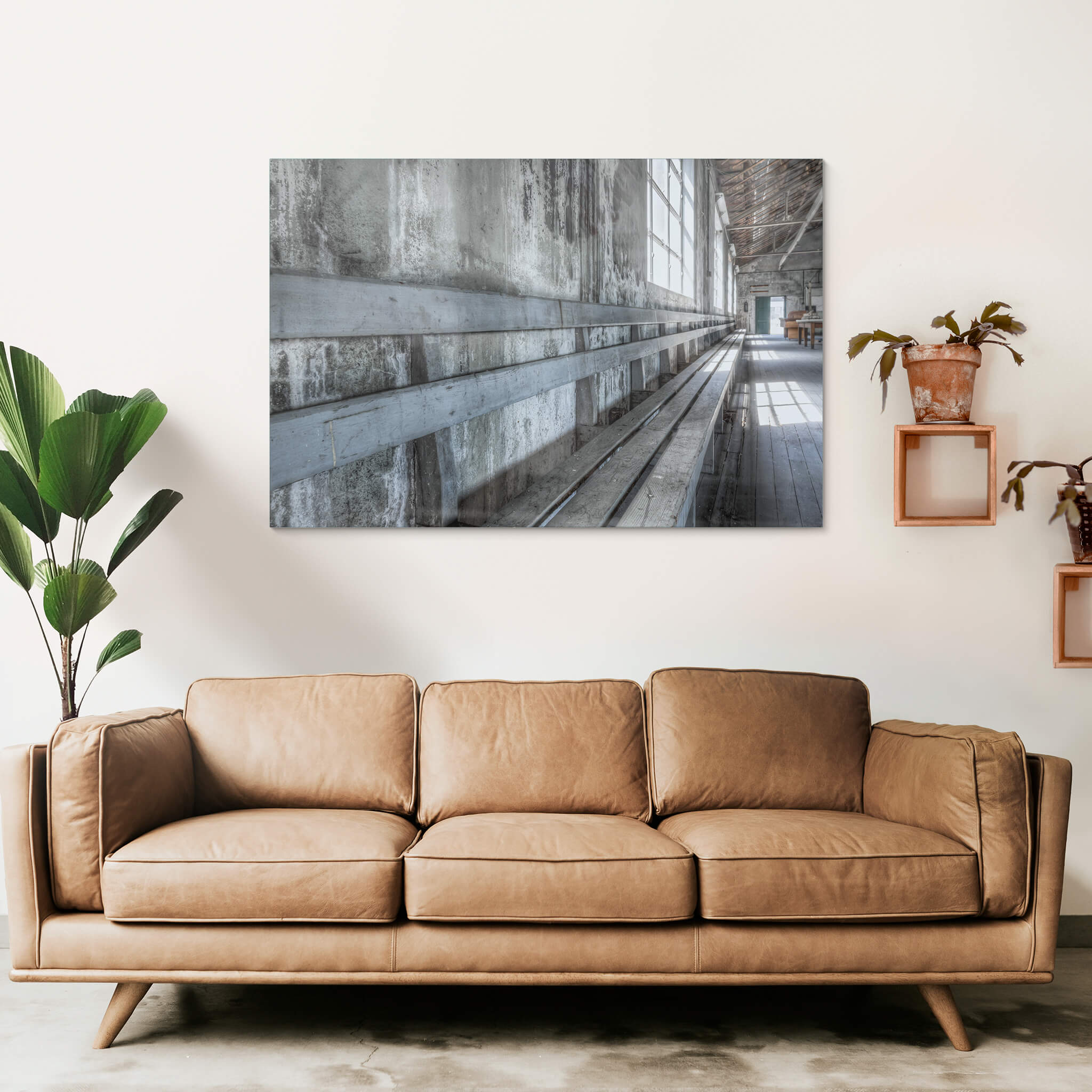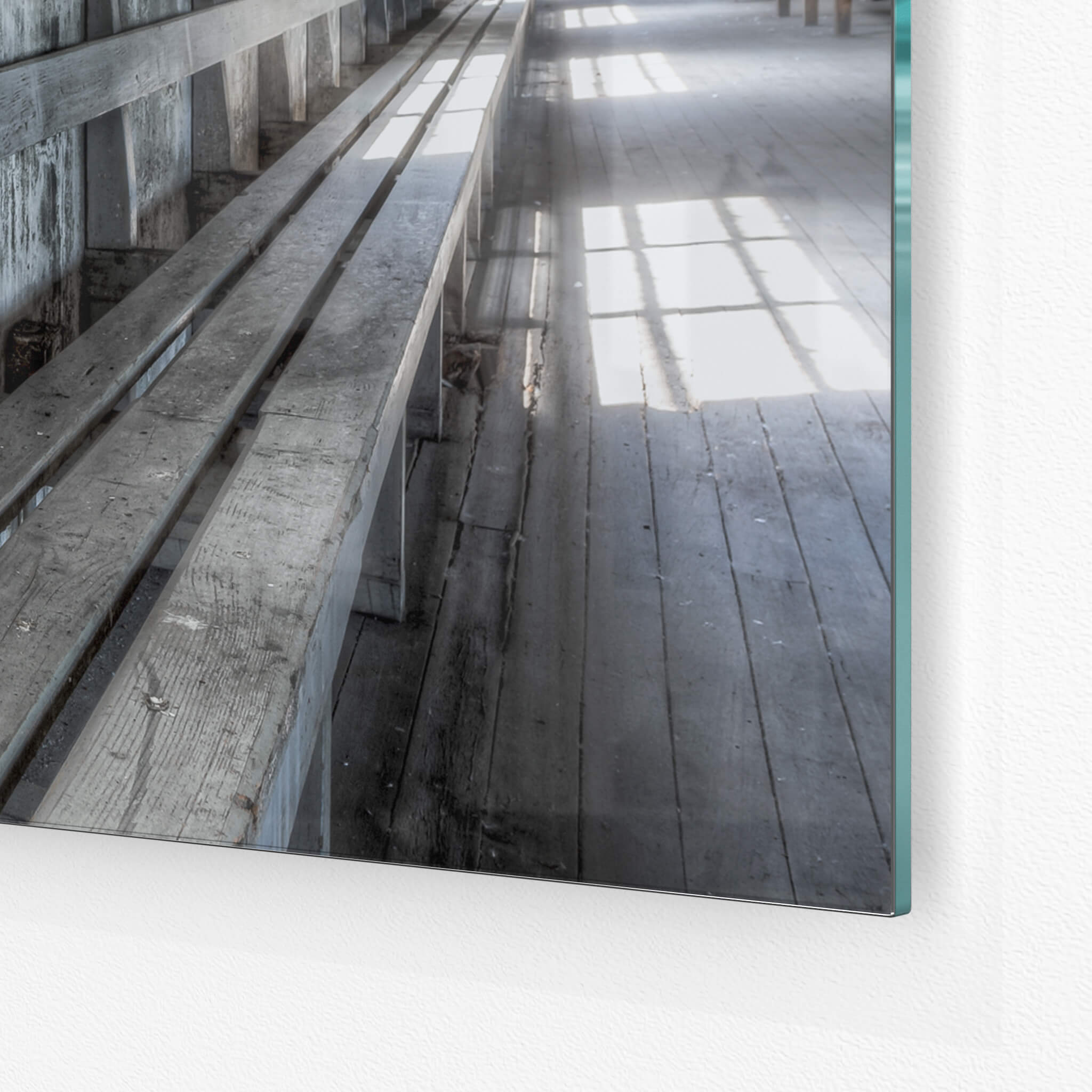 Glass print — 6mm toughened low-iron glass, bevelled edge, concealed mount.