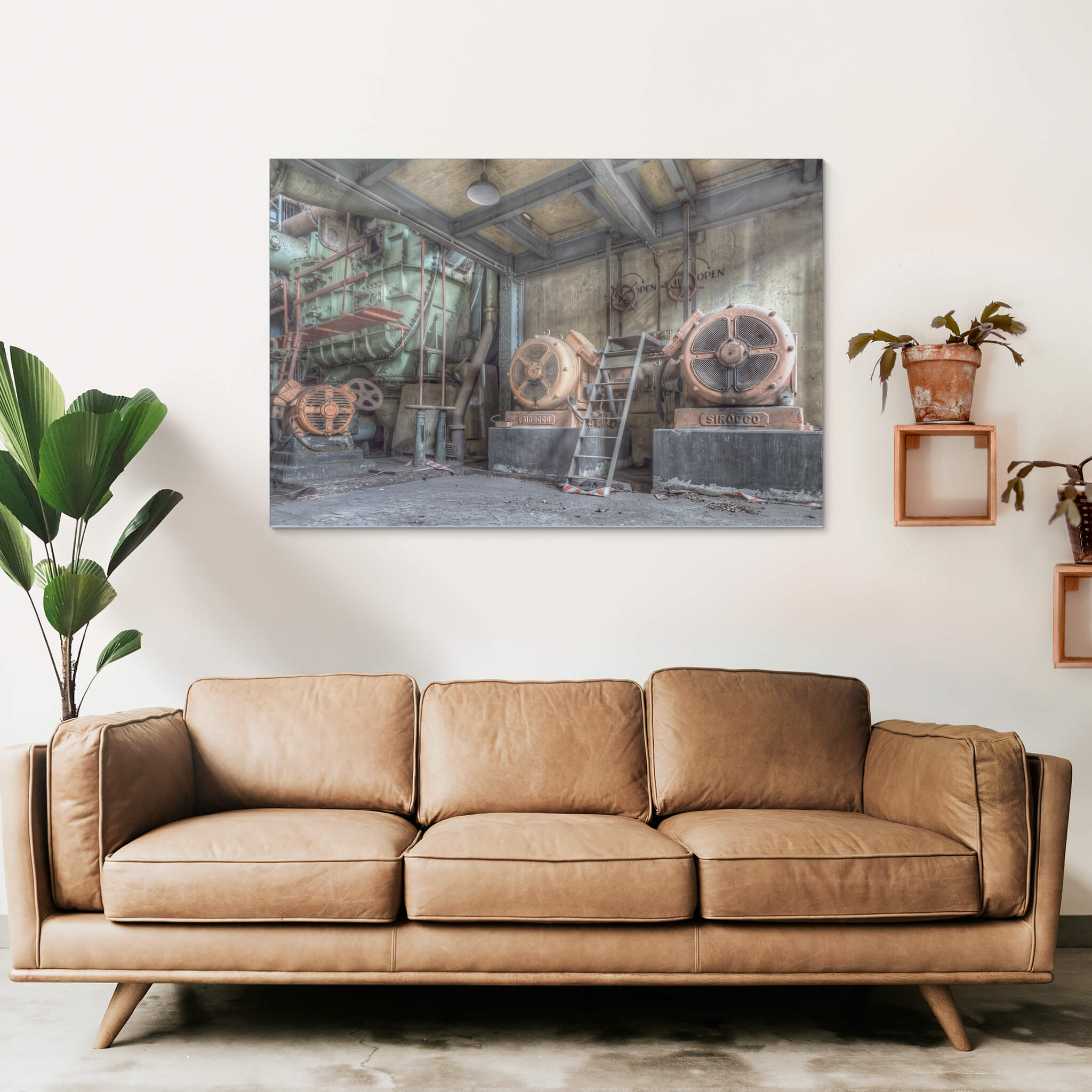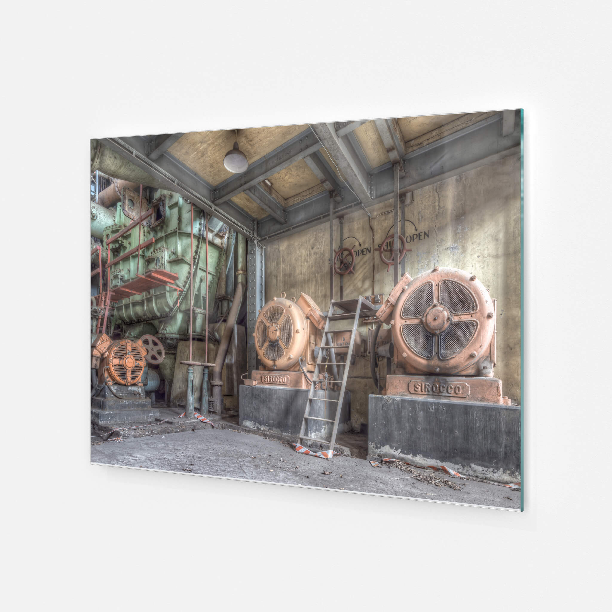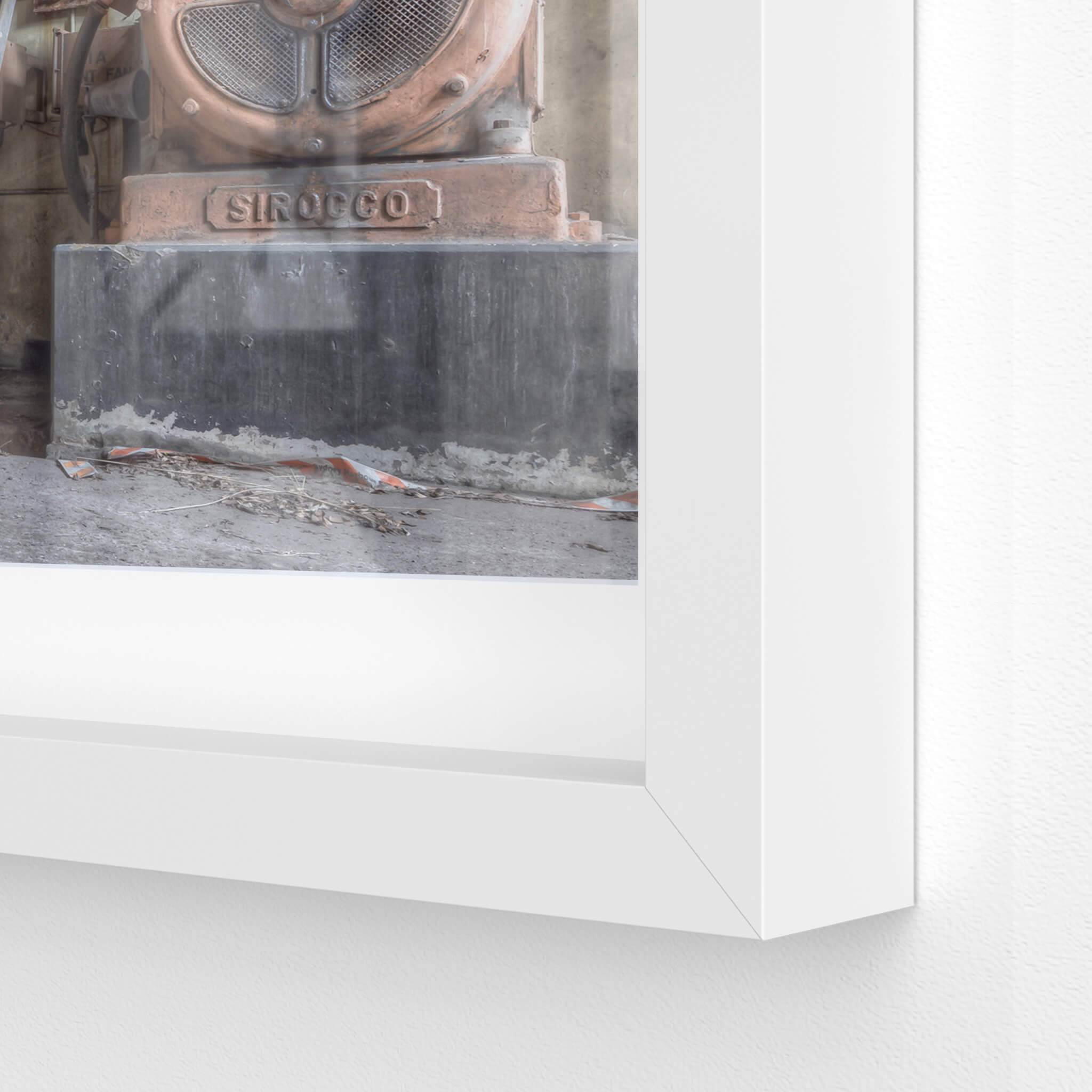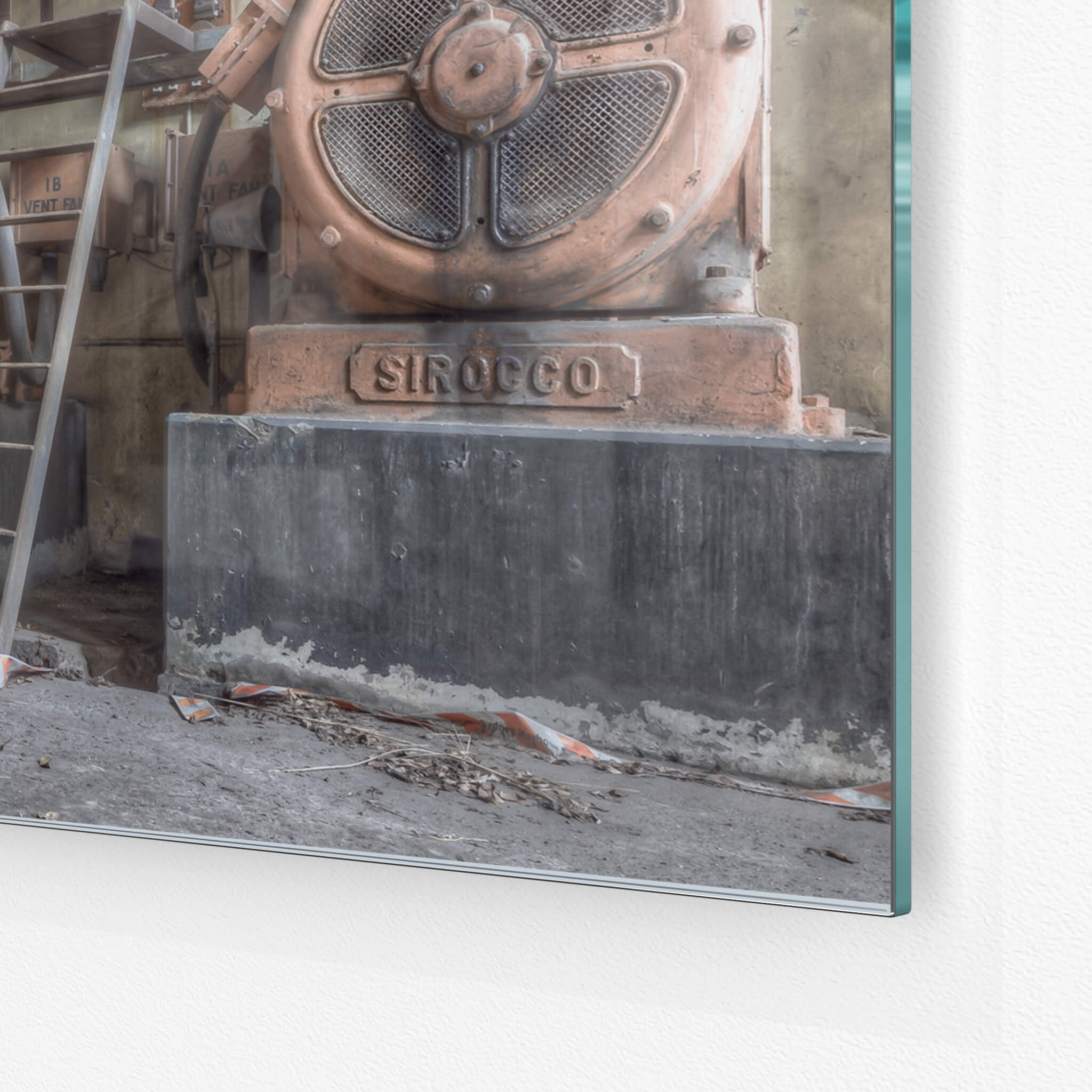 Glass print — 6mm toughened low-iron glass, bevelled edge, concealed mount.